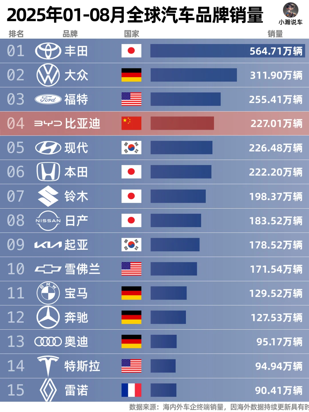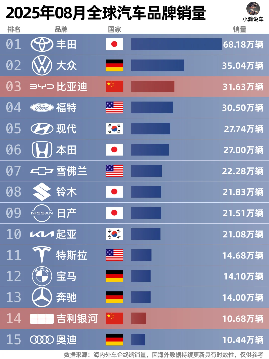 🌟总榜上:丰田月销68万依旧稳坐榜首。海外市场开始起量的比亚迪超过福特重回月销前三,年累计销量目前排在第四位。创了历史新高的吉利银河升至第十四位,成为另一个上榜的中国品牌。而奇瑞和五菱在8月分别排在16和17,随着国内“金9银10”的到来,你觉得接下来还会有中国品牌冲入月销榜前15吗?