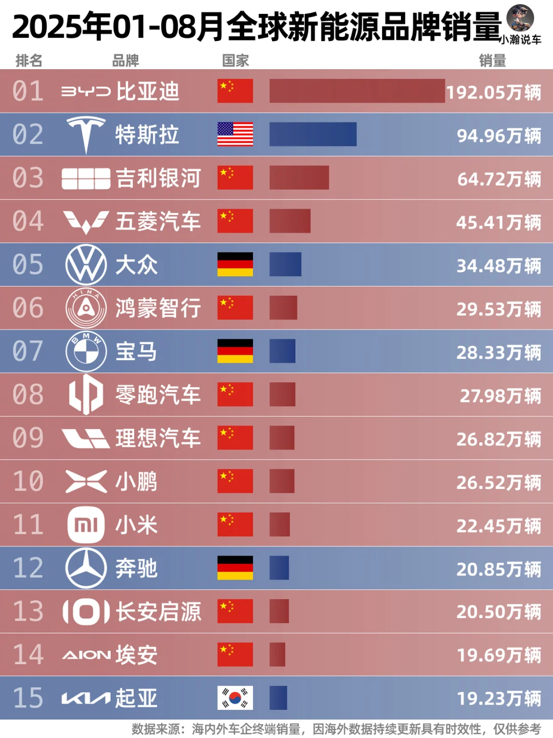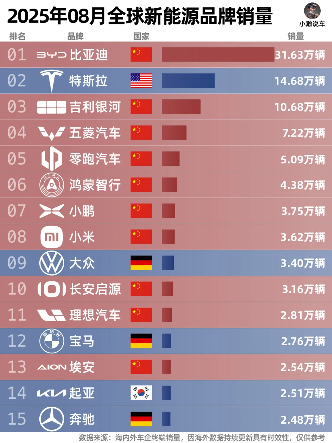 🌟新能源榜上:比亚迪的ling先优势依旧显著,破10万月销的吉利银河继续紧逼特斯拉,年销量也稳坐前三!五菱零跑紧随其后,小鹏和小米超越了大众,分列7,8位。几个中国品牌目前也都逐渐开始发力海外市场,后续新能源革命是否会席卷全球,我们一起期待吧!