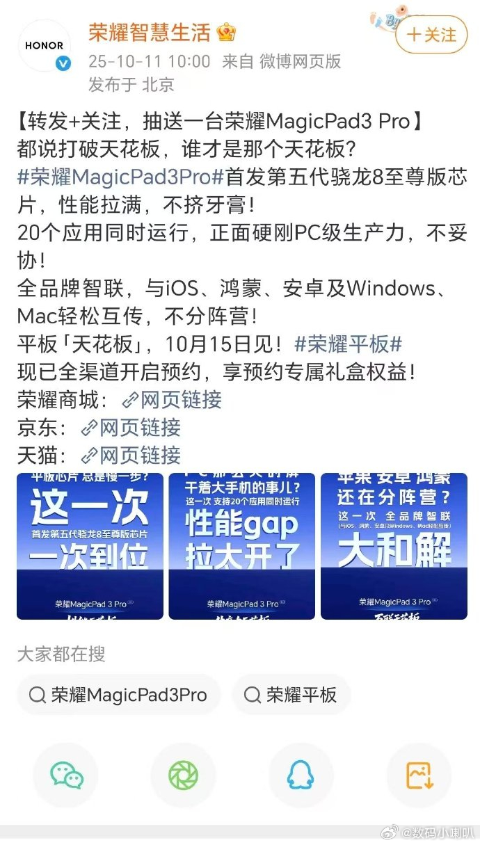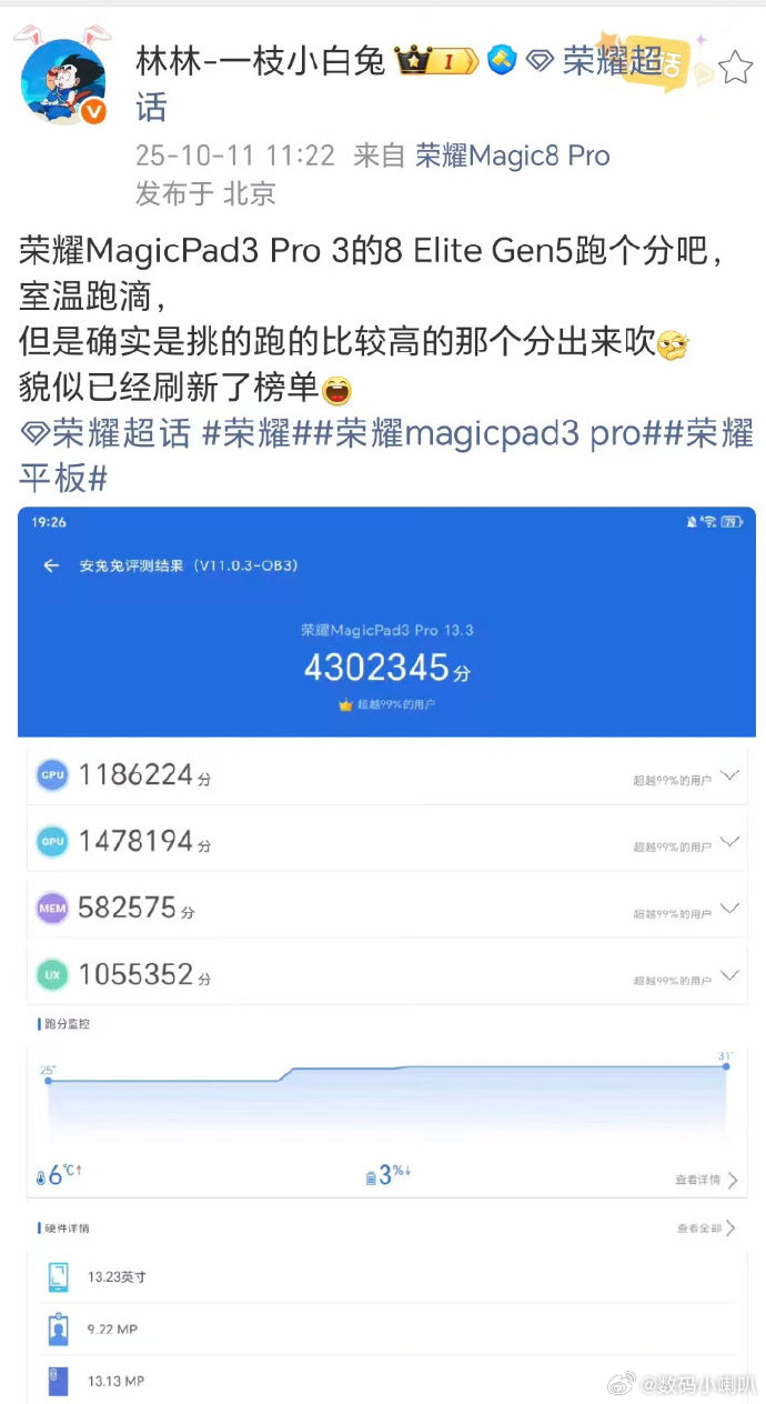 荣耀MagicPad3 Pro常温安兔兔跑分430万分!荣耀平板刷新历史跑分记录!!