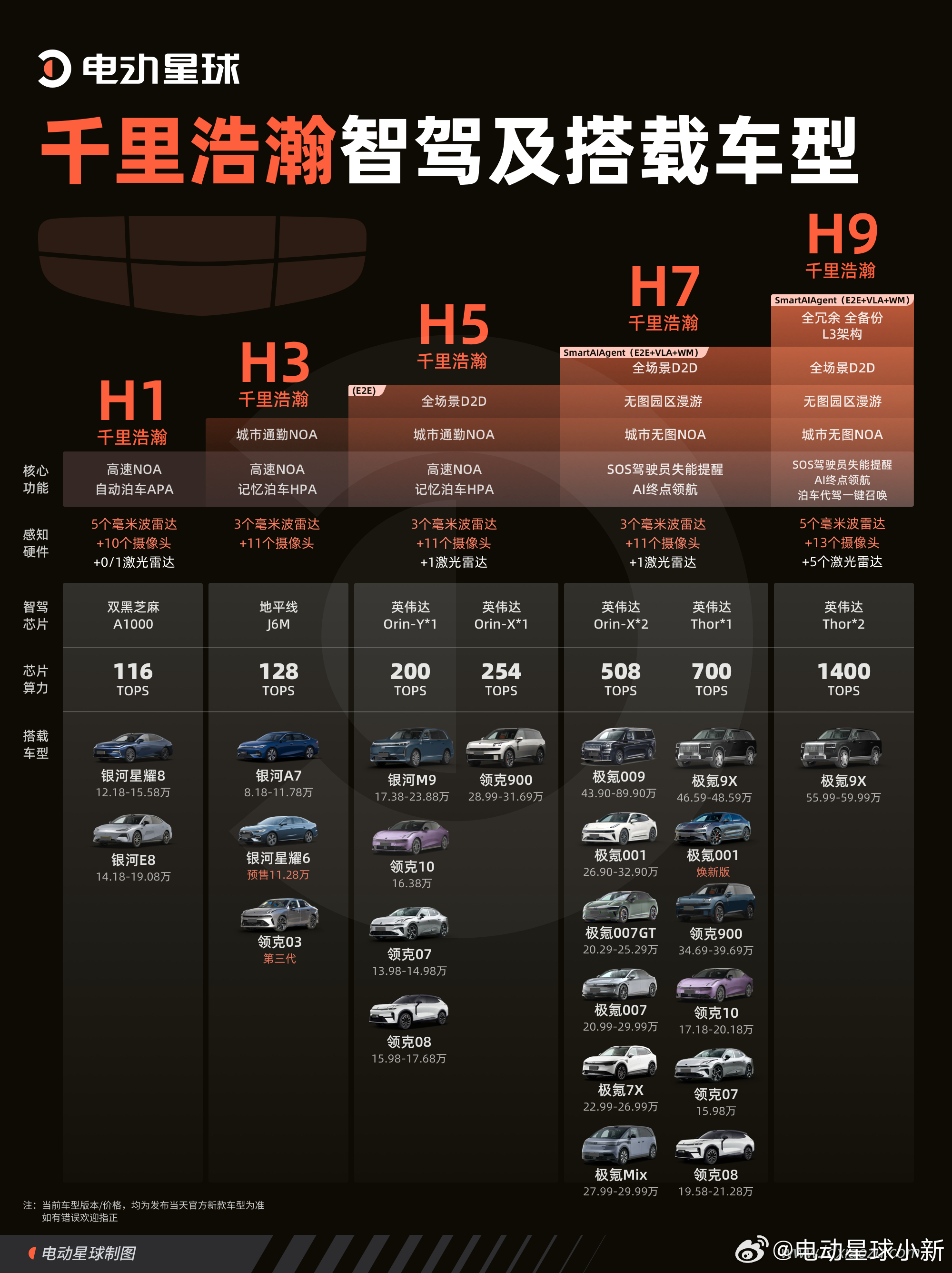 从 H1 到 H9,千里浩瀚智驾一共 5 个版型,分别是 H1、H3、H5、H7 和 H9,大概可以总结为「数字越大,能力越强」。