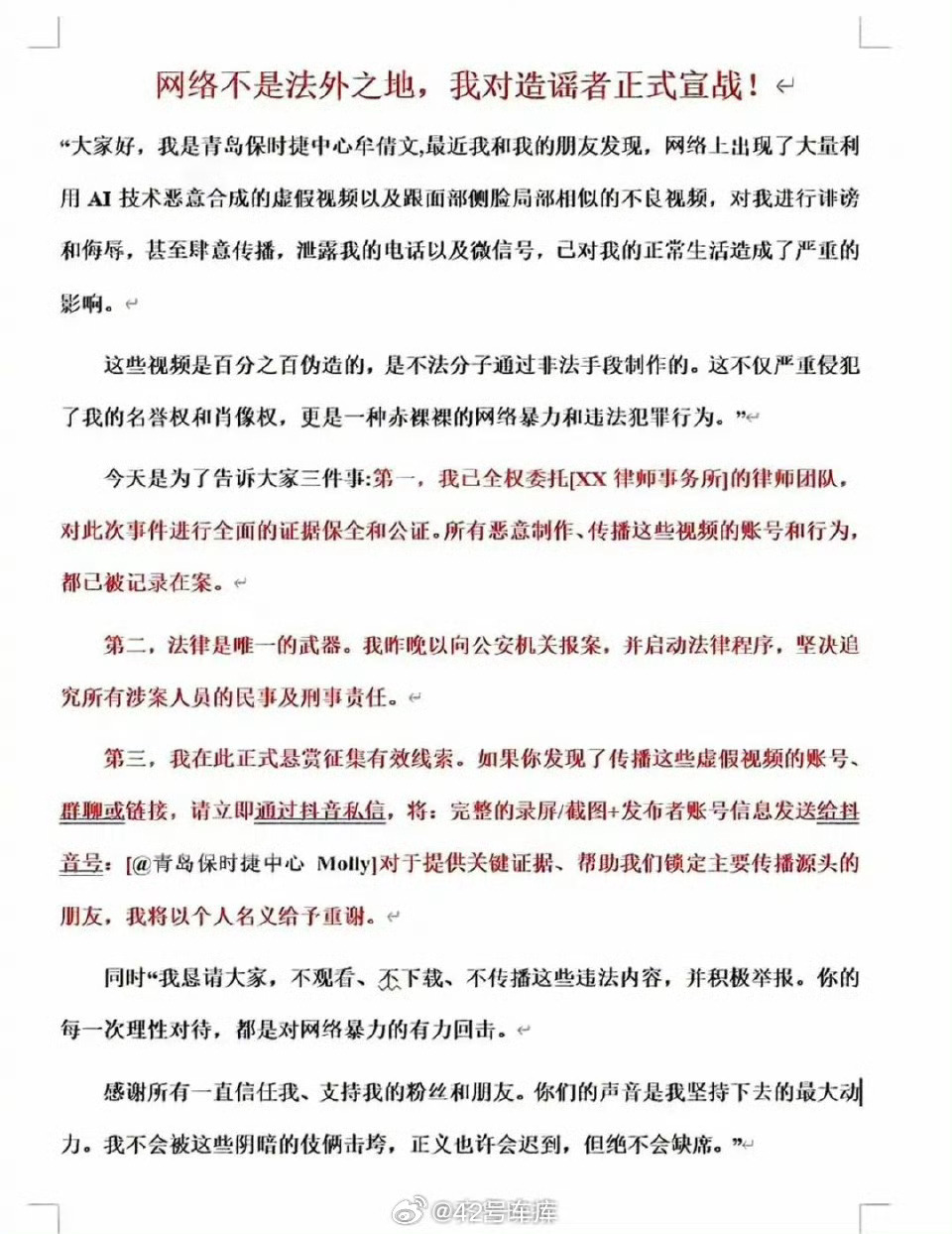 青岛保时捷销售中心牟女士近期发现由 AI 恶意合成的虚假视频和不良视频,「这些视频是百分之百伪造的」,并表示对造谣者宣战。