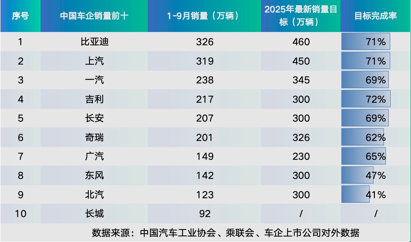 多家车企销量目标达成率亮眼,展现出强劲的发展势头。截至九月,头部车企的完成情况尤为突出。比亚迪以326万辆的累计销量,达成全年460万辆目标的71%,凭借技术优势与海外扩张持续领跑;上汽集团销量达319.3万辆,燃油与新能源双线布局稳健。此外,吉利汽车以217万辆实现72%的目标完成率,位居行业前列;长安、一汽也分别以超过200万辆的销量,达成全年目标的约69%,多品牌战略成效显著。