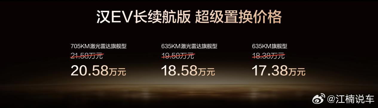 此次,汉DM-i长续航版共推出4款车型,补贴后售价15.98万~18.98万元;汉EV长续航版共推出3款车型,补贴后售价17.38万~20.58万元(10月31日前完成购车可享1万元超级置换补贴)。同时,比亚迪还为用户准备了包含置换补贴在内的至高价值3.8万元七大礼遇。