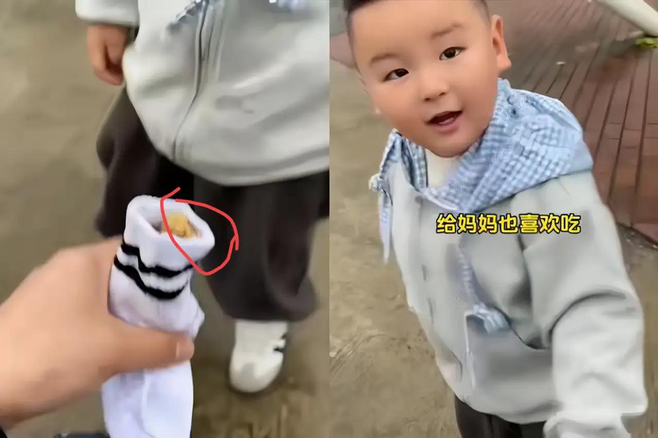 小小年纪就知恩图报,不光把自己喜欢但舍不得吃拿给爸爸妈妈,而且怕凉了还用袜子包好