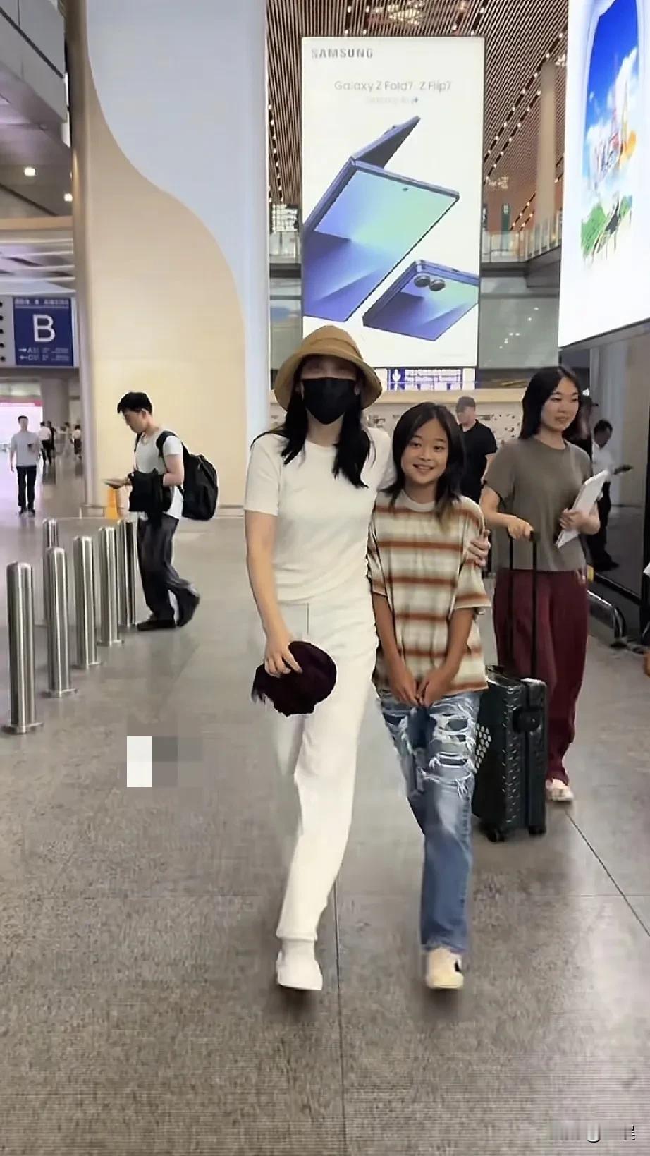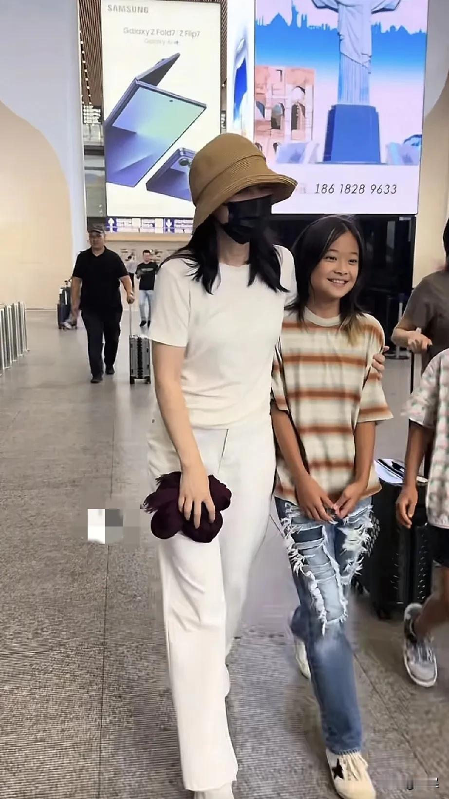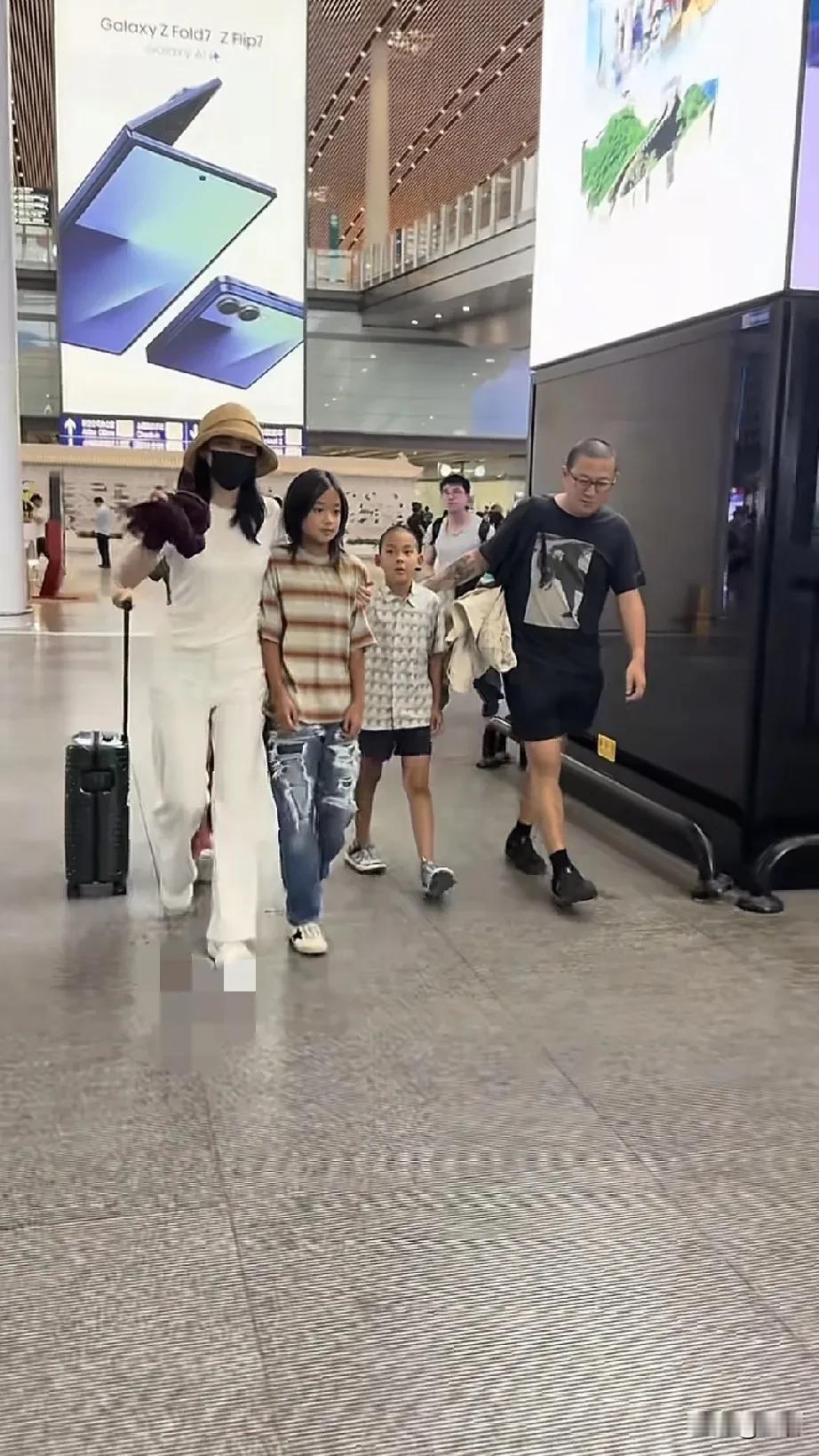 在机场的人流中,梅婷一家四口步伐轻快。她一身简约白装搭配帽子口罩,手推行李又似护着身边孩子;身旁条纹衣配破洞裤的孩子、穿格纹衫短裤的娃,还有同行家人