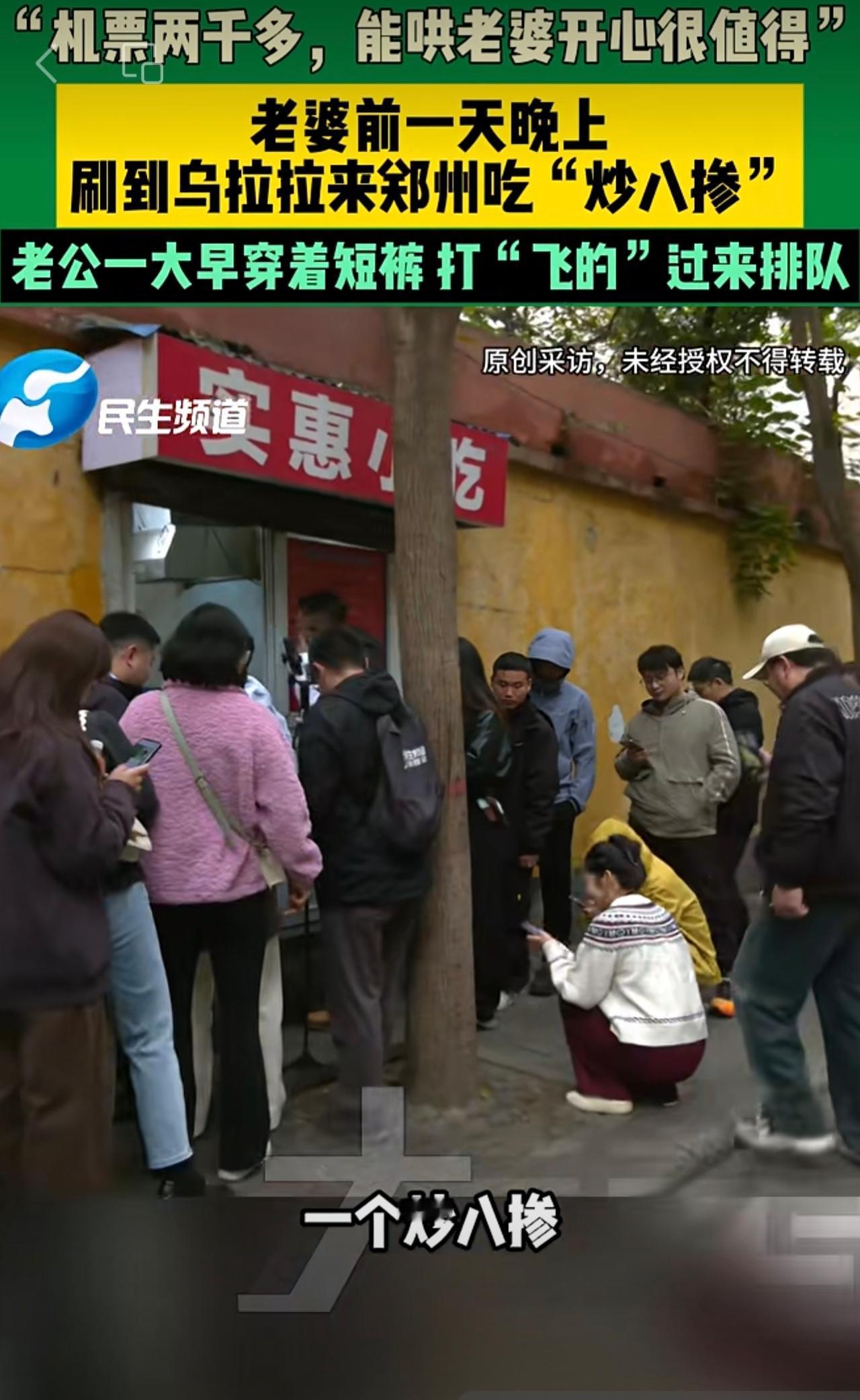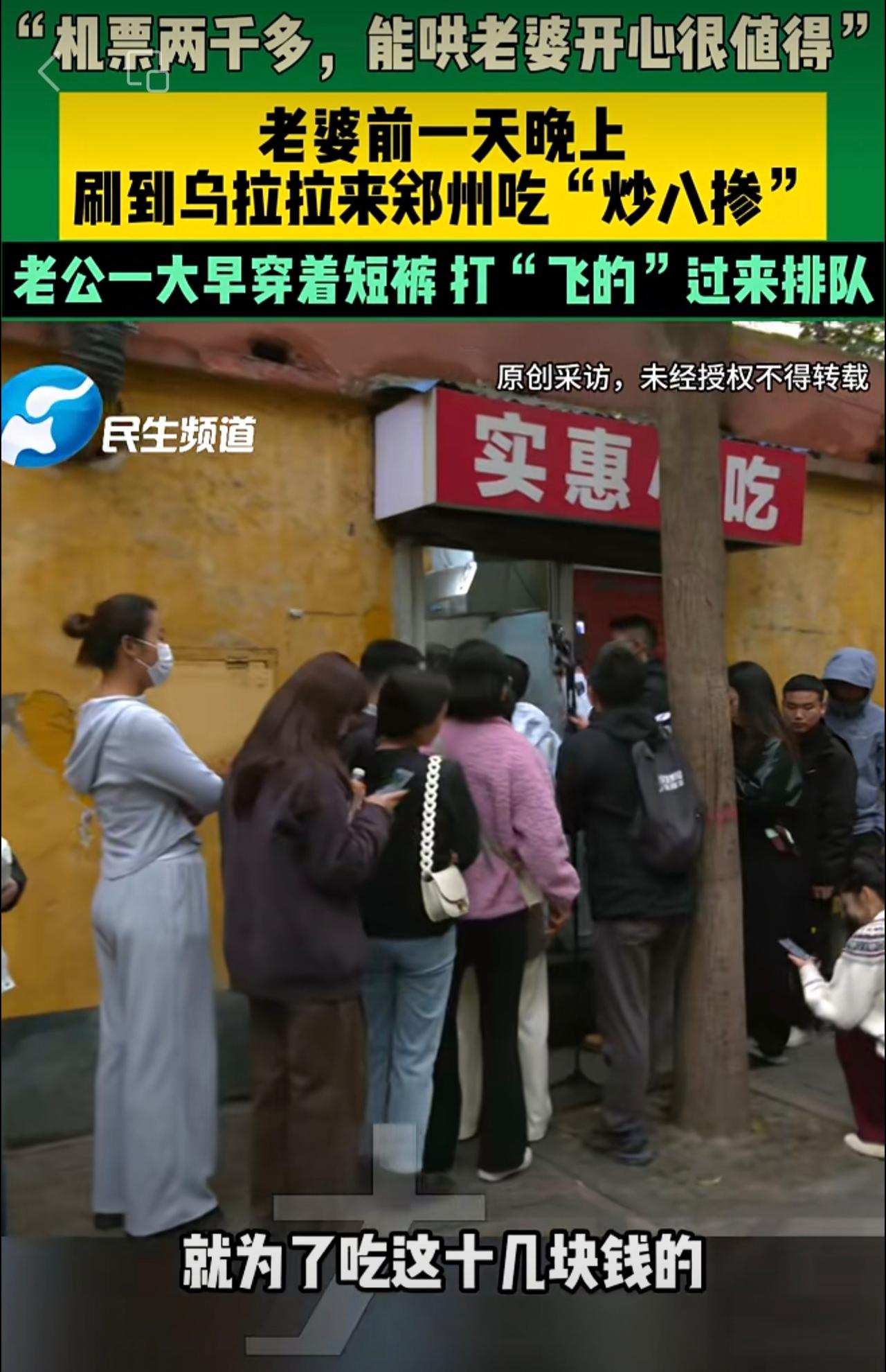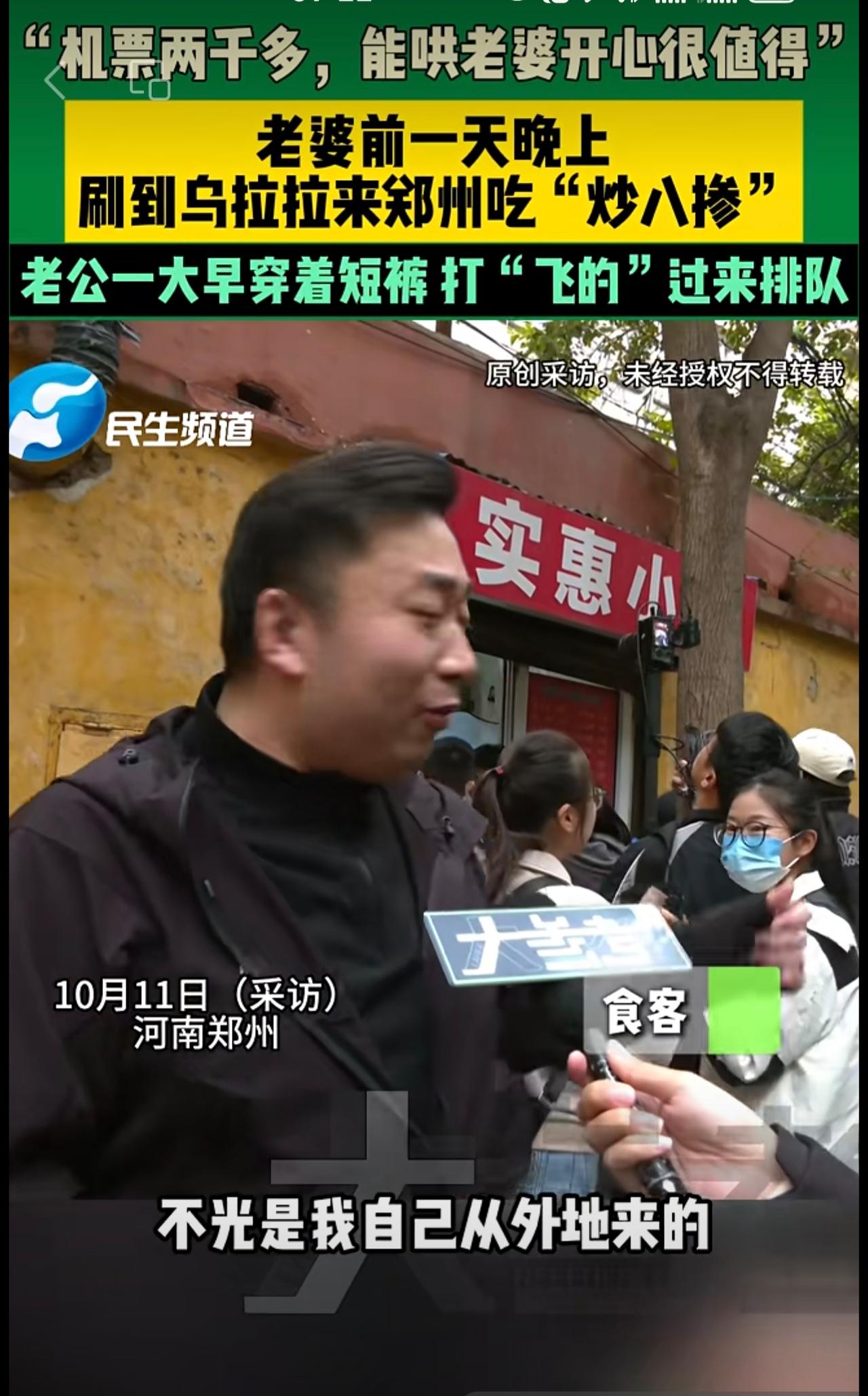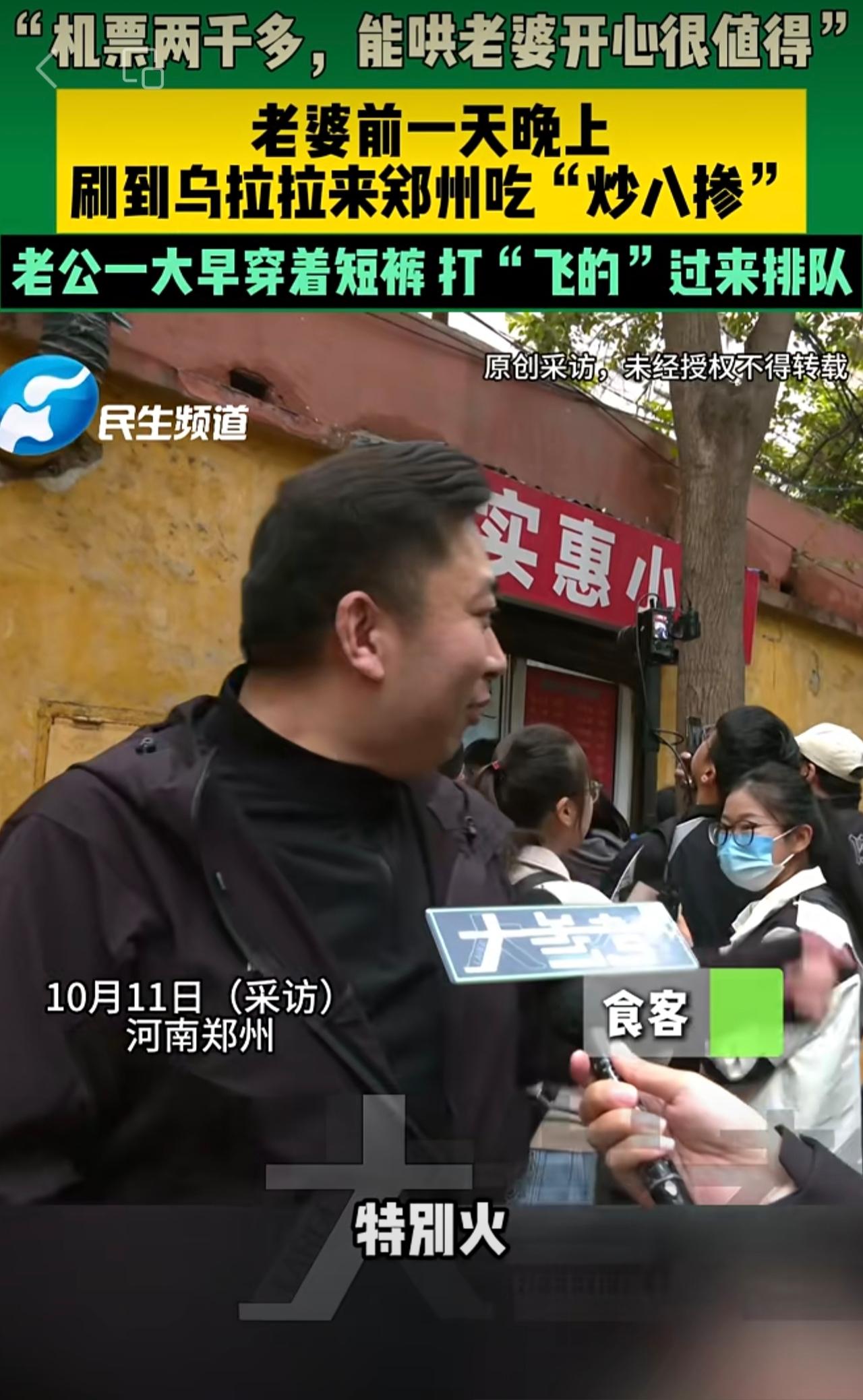 10月11日(采访)河南郑州。“机票两千多,能哄老婆开心很值得”老婆前一天晚上刷到乌拉拉来郑州吃“炒八掺”老公一大早穿着短裤 打“飞的”过来排队[捂脸]
