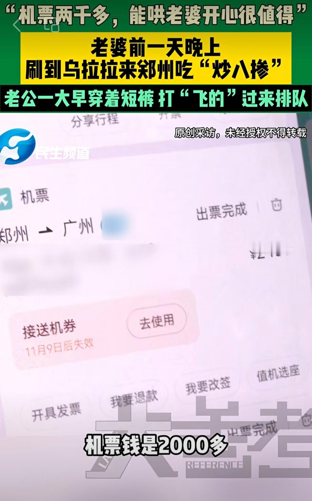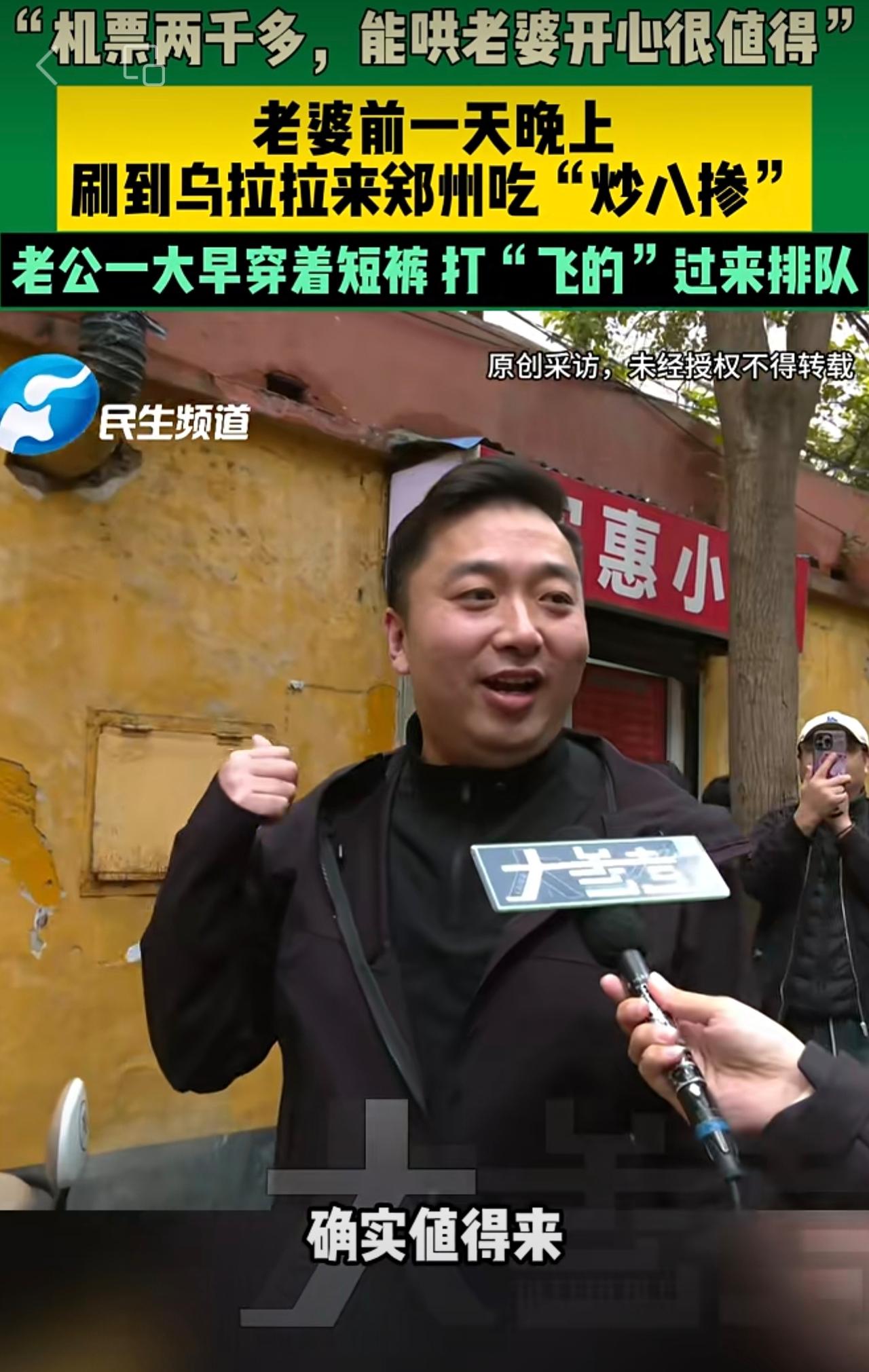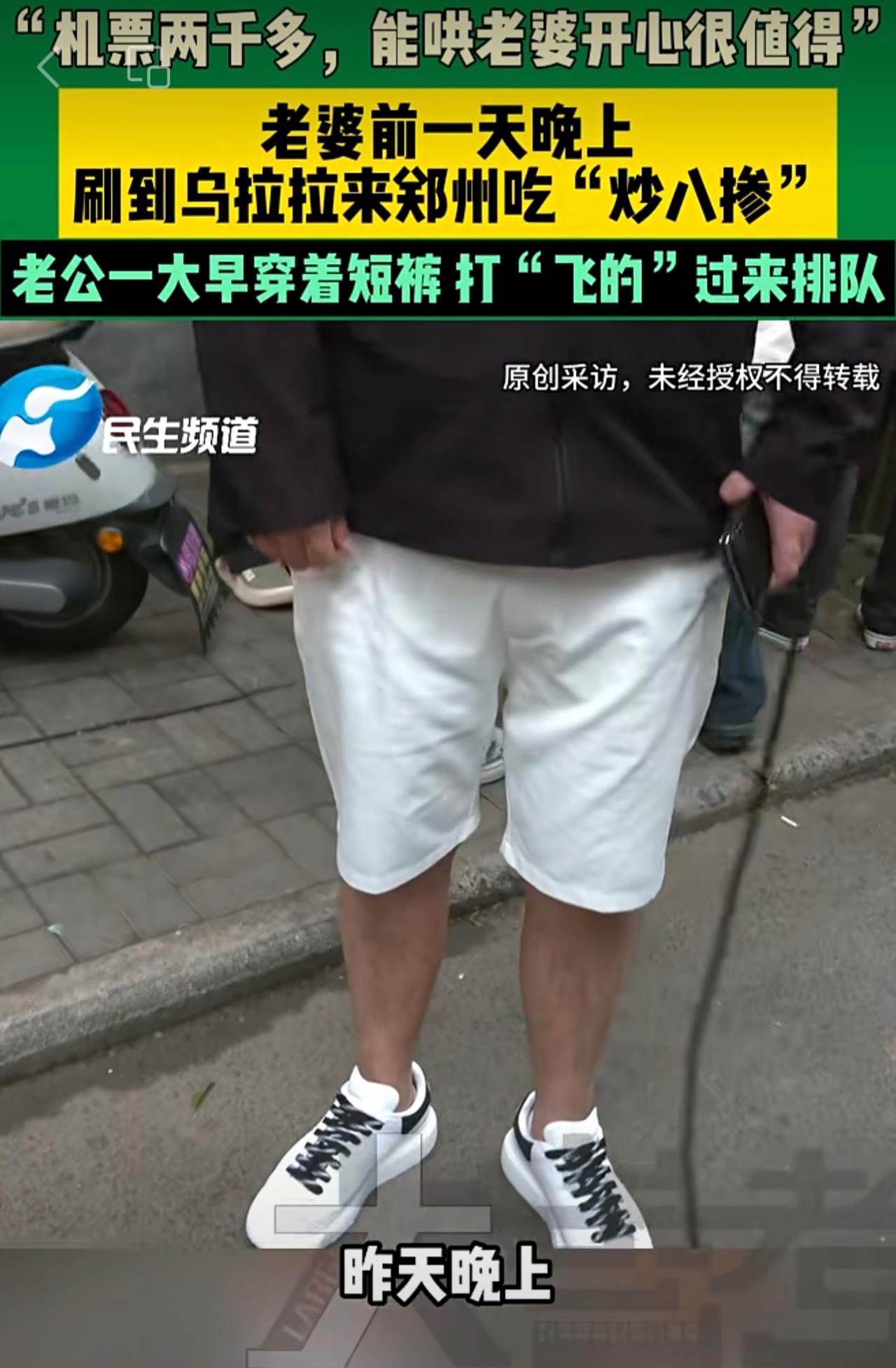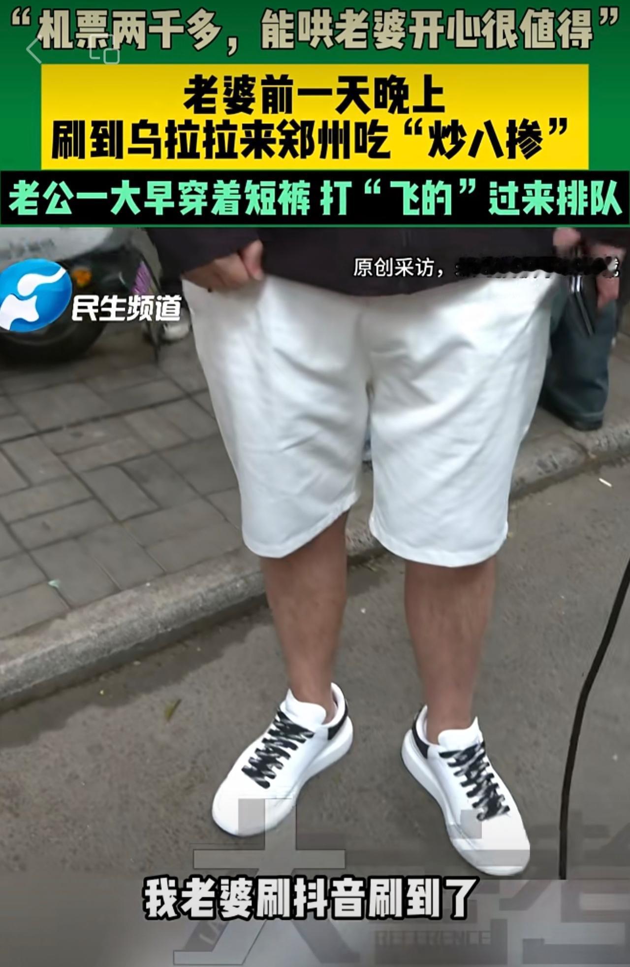 10月11日(采访)河南郑州。“机票两千多,能哄老婆开心很值得”老婆前一天晚上刷到乌拉拉来郑州吃“炒八掺”老公一大早穿着短裤 打“飞的”过来排队[捂脸]
