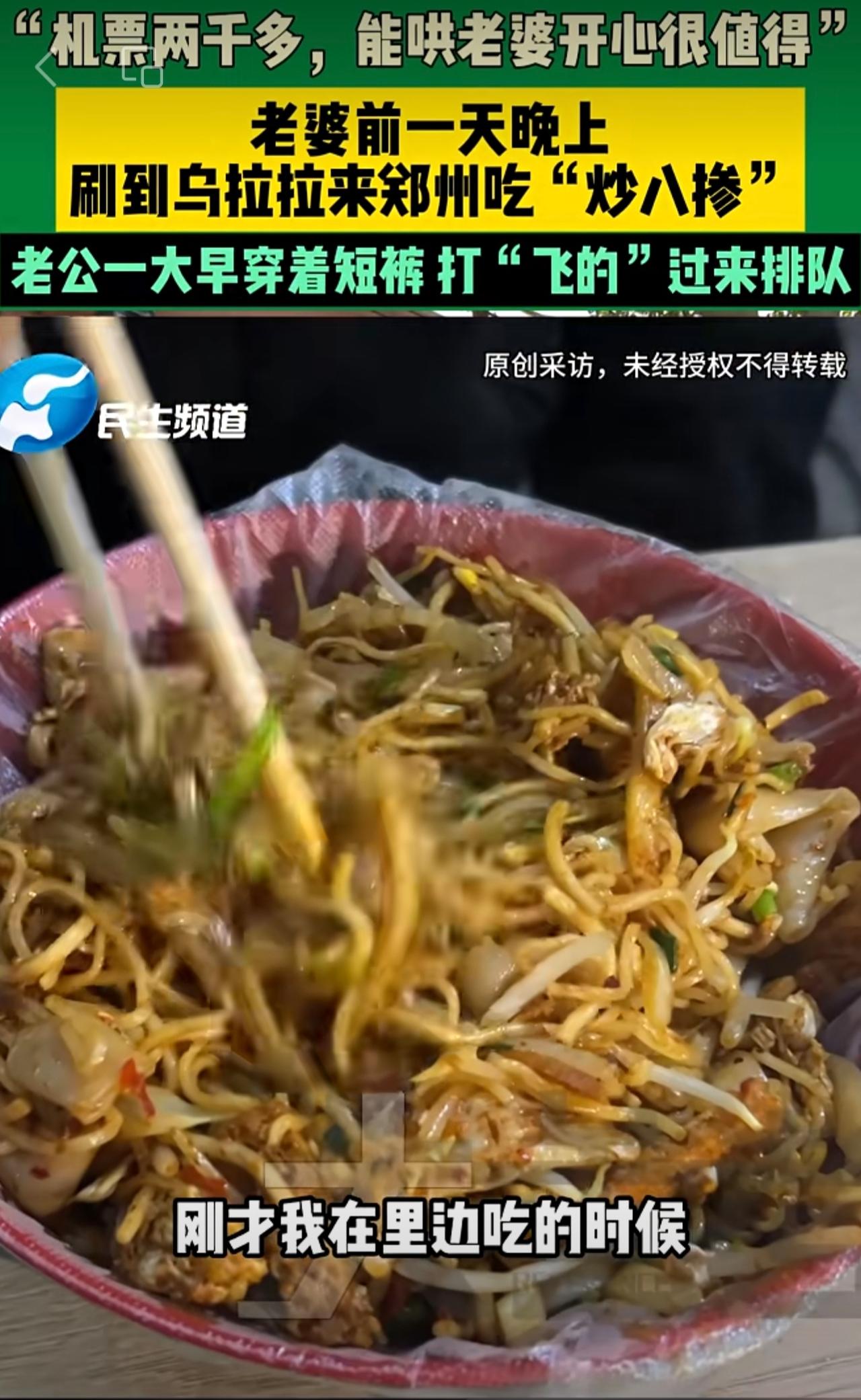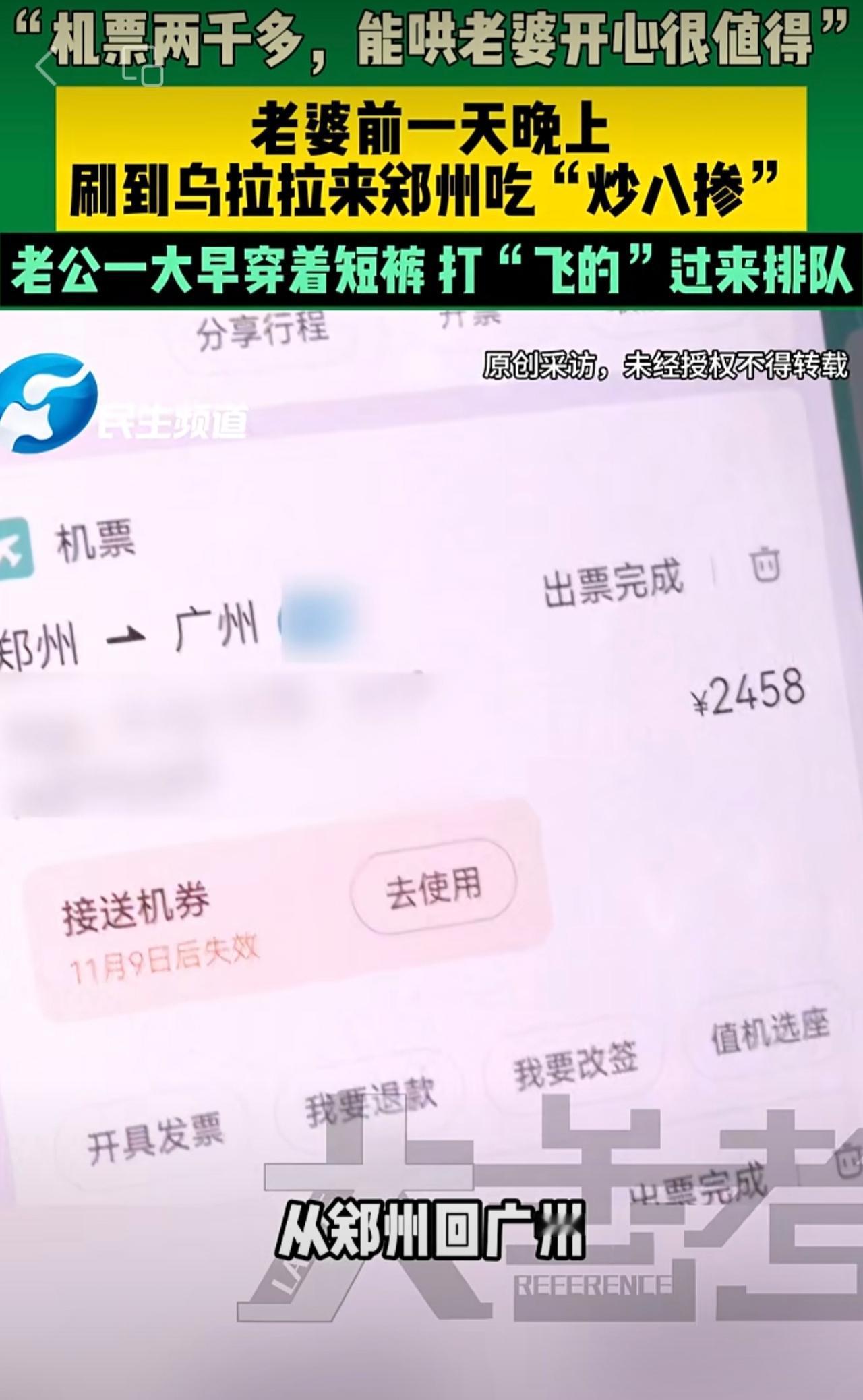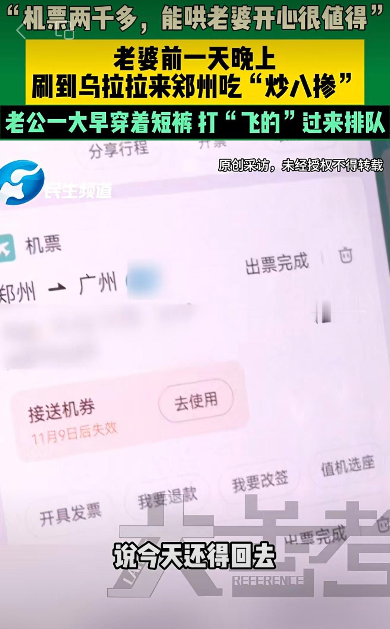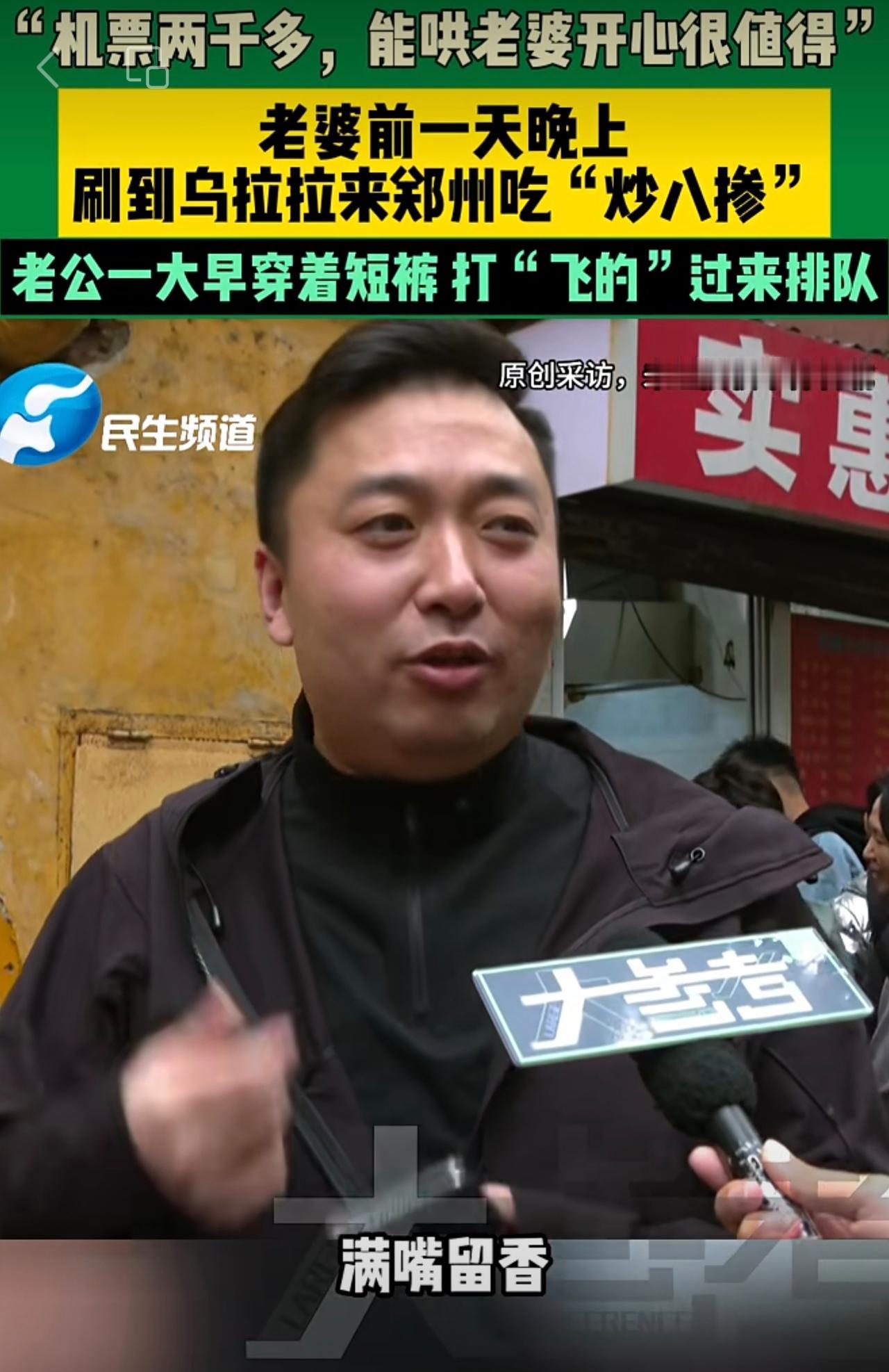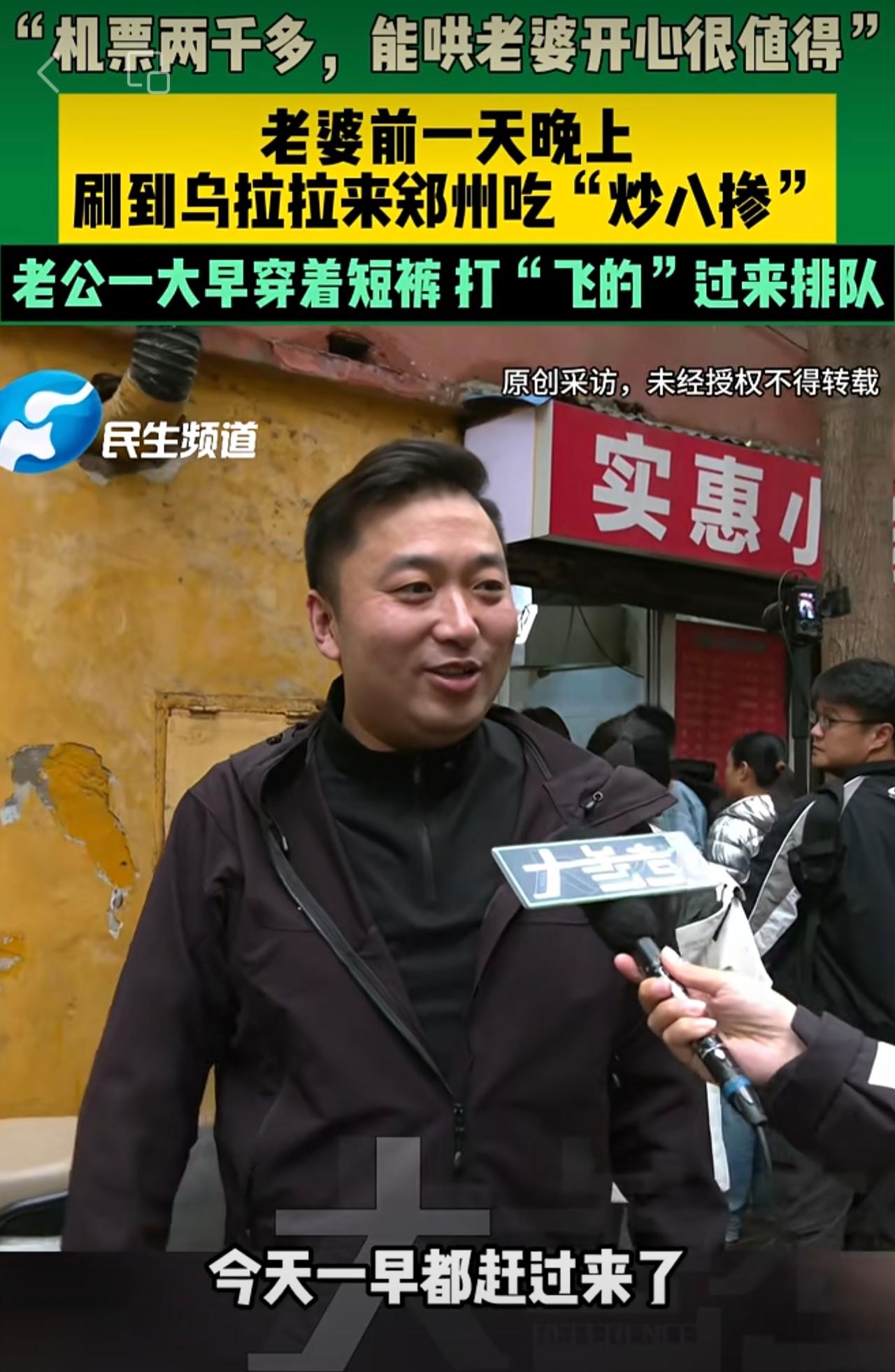 10月11日(采访)河南郑州。“机票两千多,能哄老婆开心很值得”老婆前一天晚上刷到乌拉拉来郑州吃“炒八掺”老公一大早穿着短裤 打“飞的”过来排队[捂脸]