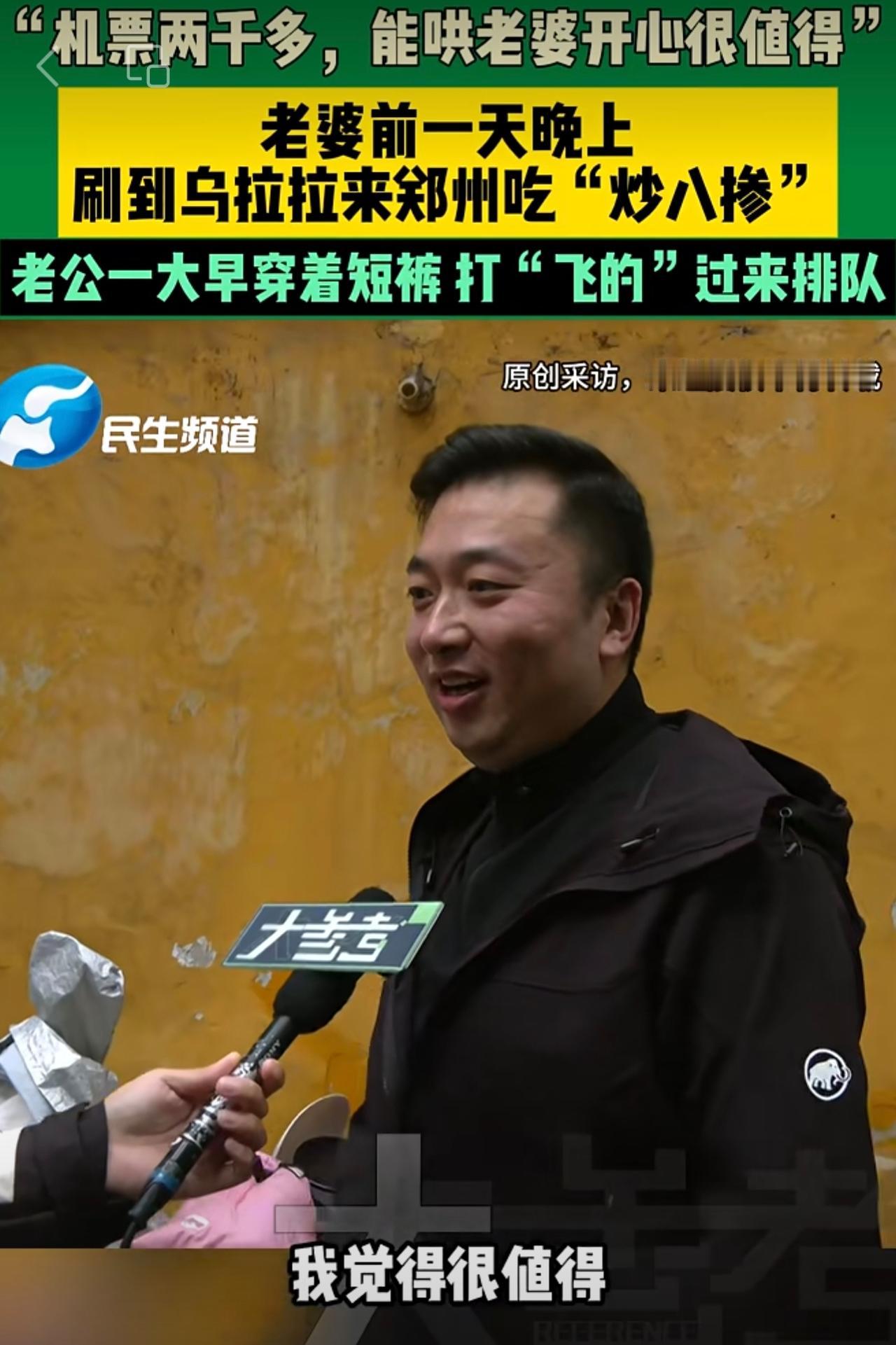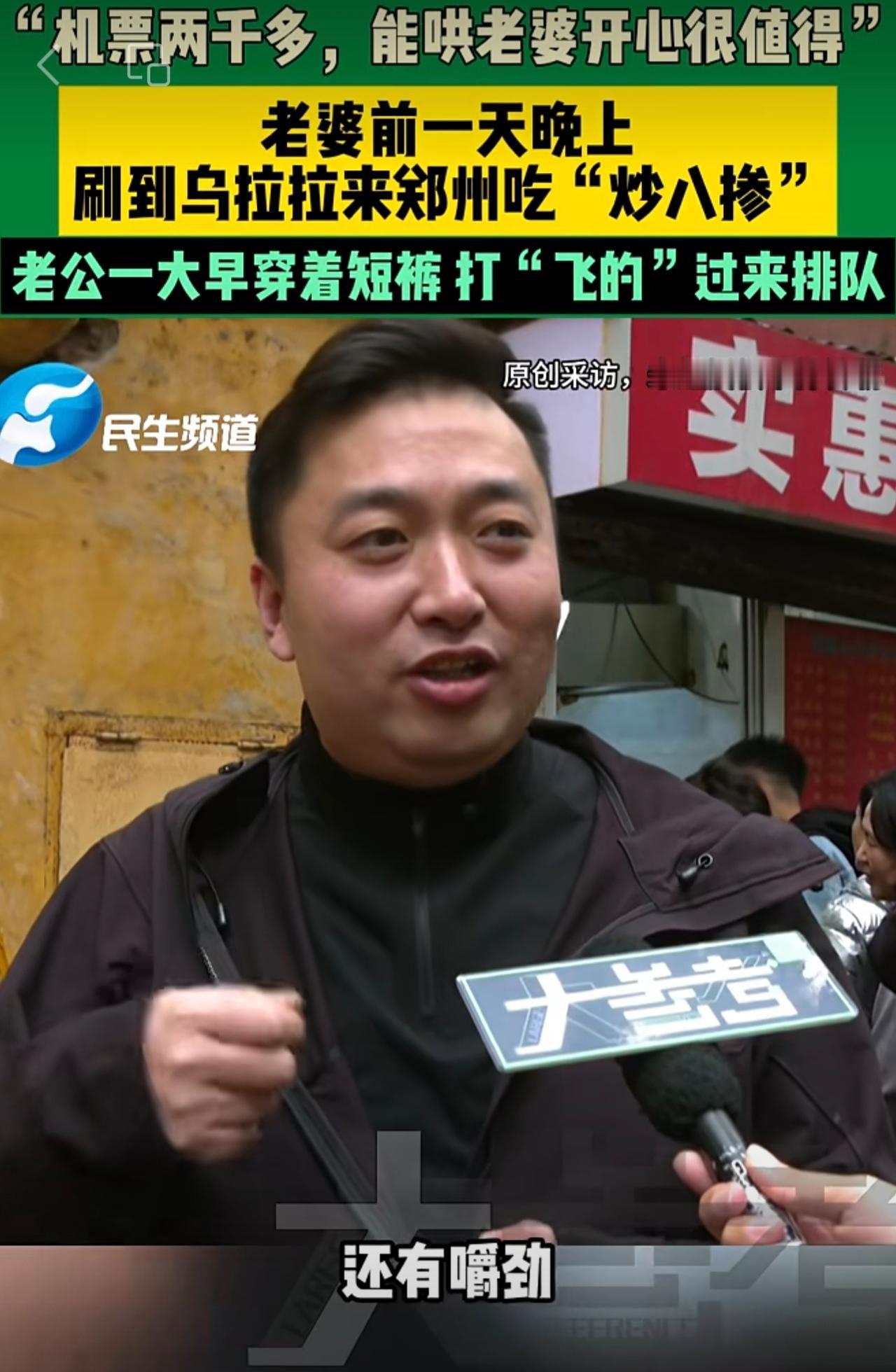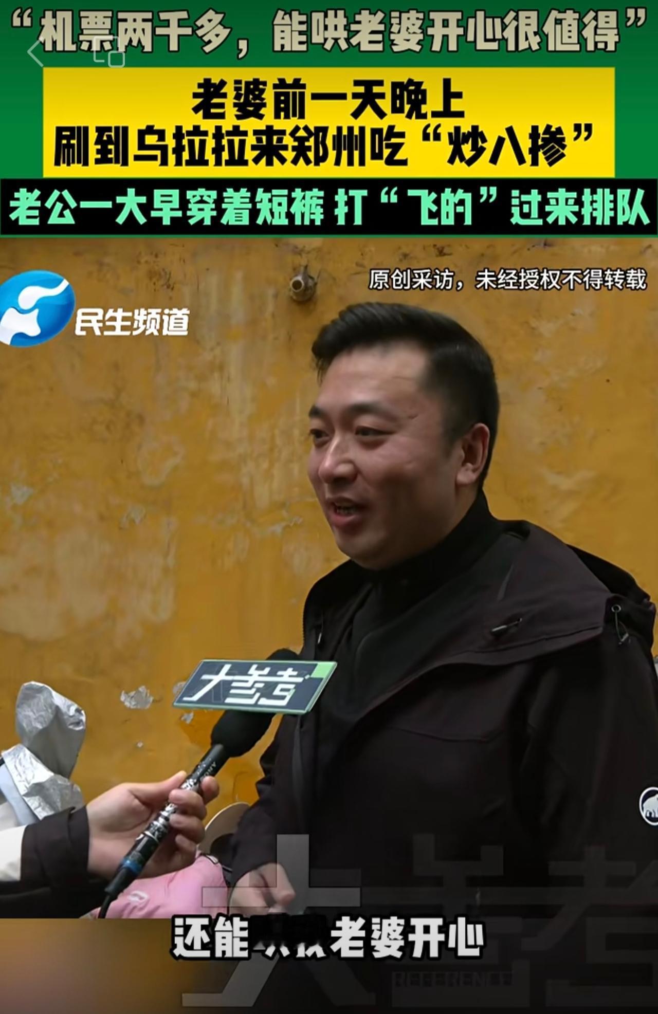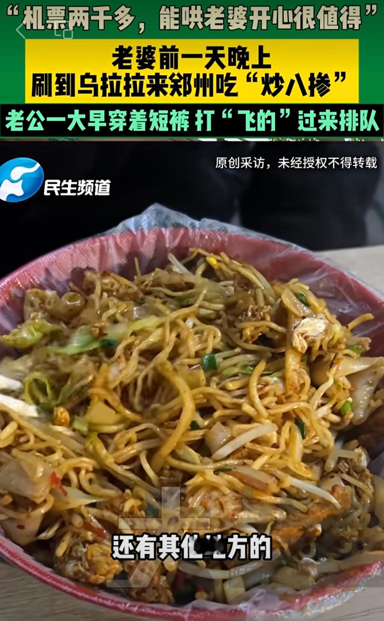 10月11日(采访)河南郑州。“机票两千多,能哄老婆开心很值得”老婆前一天晚上刷到乌拉拉来郑州吃“炒八掺”老公一大早穿着短裤 打“飞的”过来排队[捂脸]