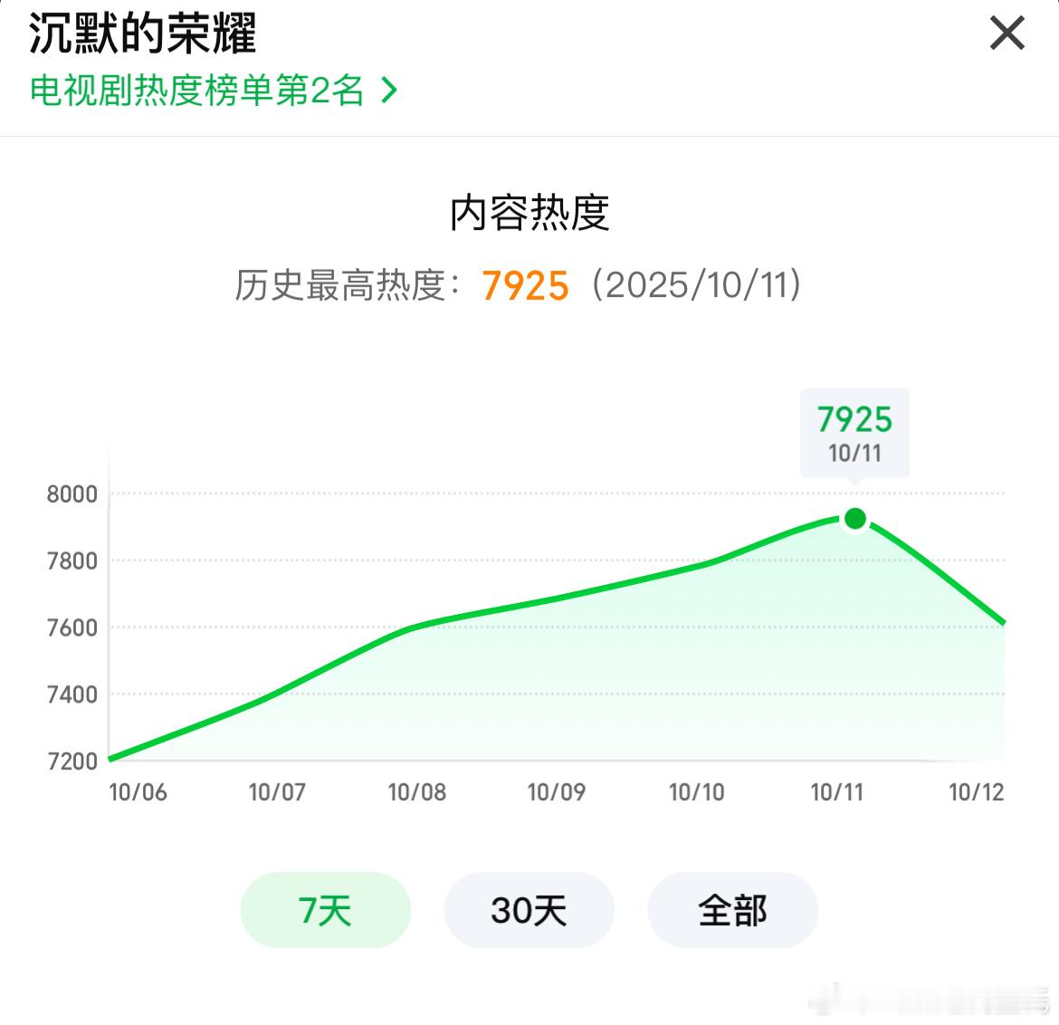 电视剧沉默的荣耀 2.69,集均2.308升至央⑧年季,爱奇艺热度7925,有望冲8000