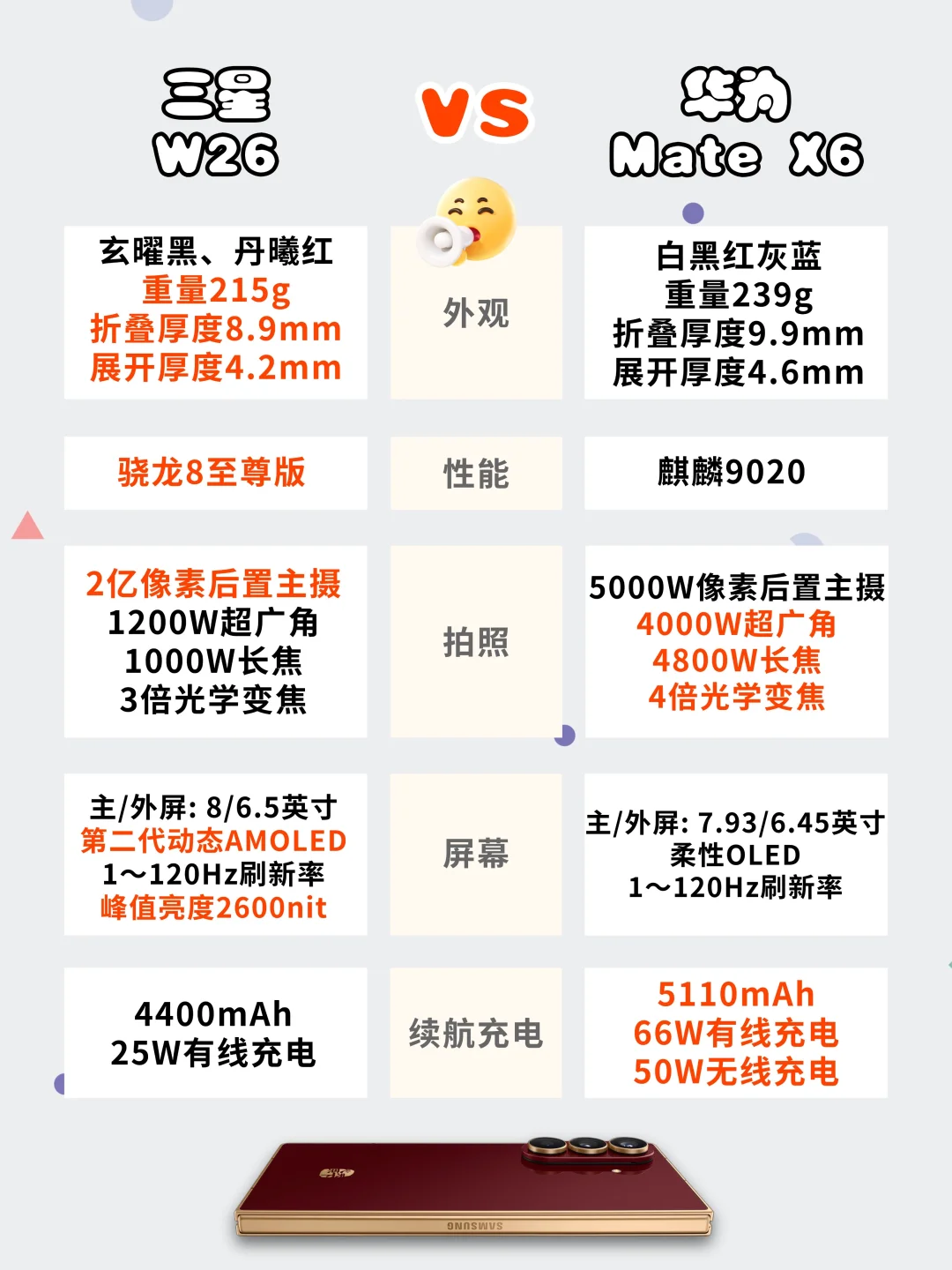 另外在性能上W26搭载了骁龙8至尊版处理器⚡️,续航方面依旧是4400mAh大小的电池,相对而言,华为Mate X6的续航充电配置更高一些。