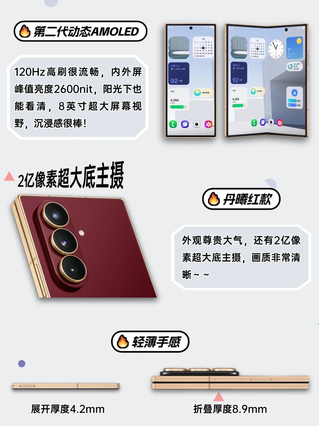 除了经典的黑金配色外,三星W26新发布了一款丹曦红的款式,以中式美学的新姿态亮相,搭配“璁珑天逸”专属动态壁纸,外观看起来十分大气尊贵。