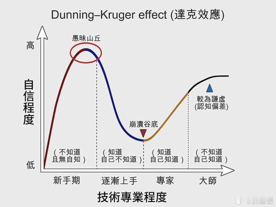 我們大概都走過那條曲線:剛接觸一個領域的時候,覺得簡單透了,信心滿滿地站在「愚昧山丘」上;再學深一點,就被現實打回原形,跌進「崩潰谷底」;只有熬過那段懷疑與低谷,才慢慢學會謙遜——那時你不再急著表態,也不再想證明什麼,只是安靜地看著別人重演你的過去。