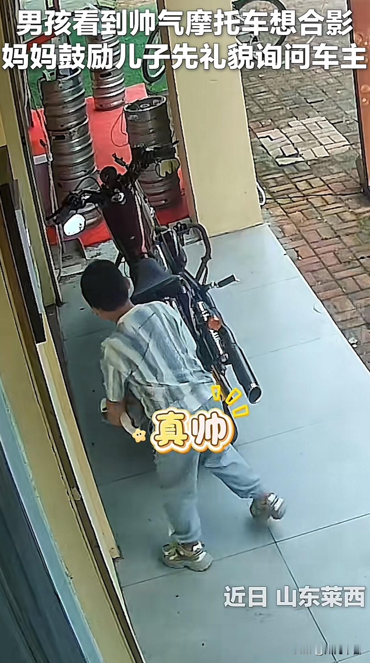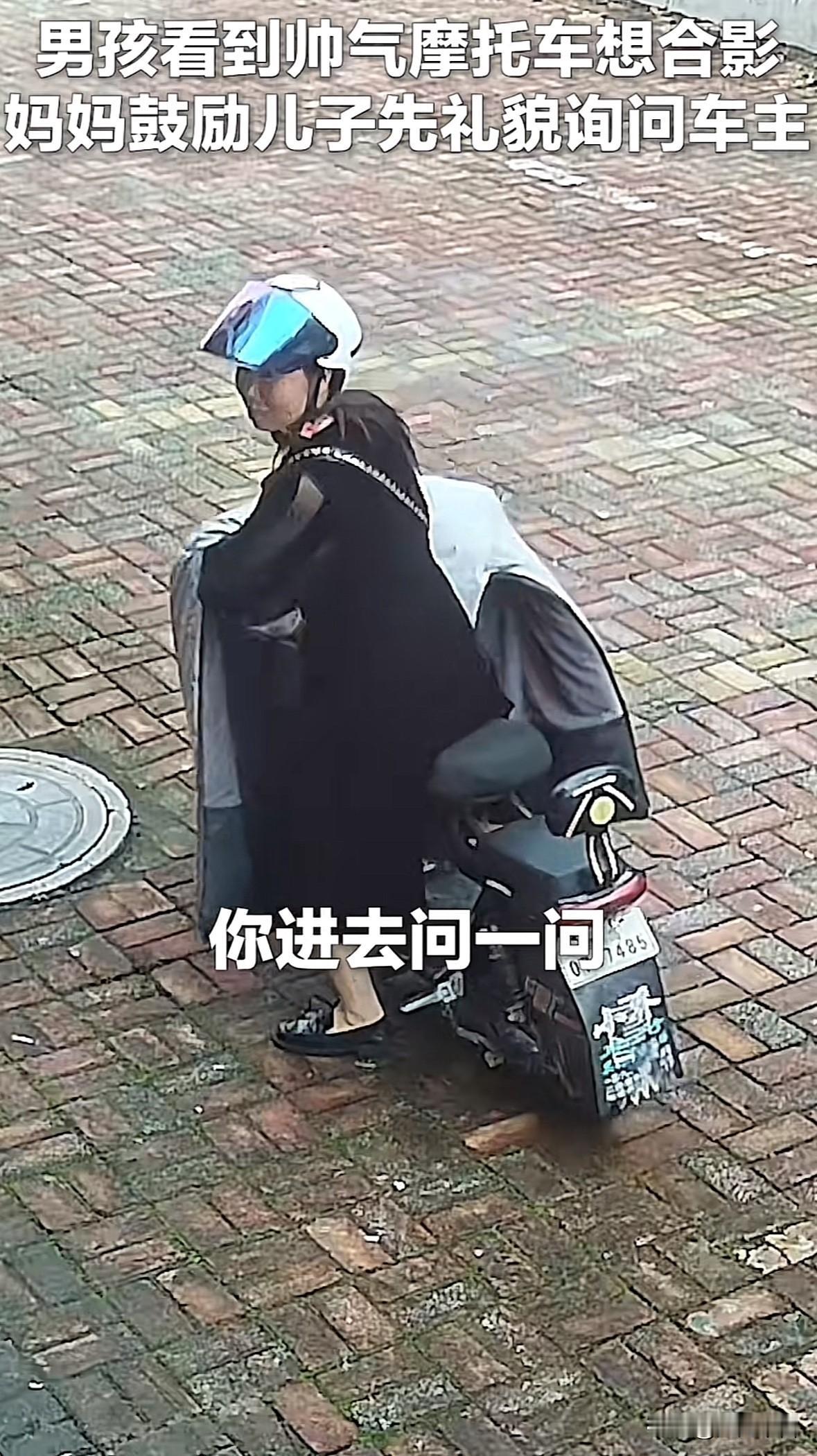 优秀的家教真棒,山东蓬莱这位母亲教儿子的做法值得所有父母学习 近日她儿子看到一辆很帅气的摩托车,便想去拍照,但她及时制止了儿子,问他可经过别人同意了?然后鼓励他进去询问下车主是否可以拍照 没想到儿子进去询问后,车主很爽快地答应了,不仅给他拍照,还让他坐在车上拍,又暖心地提醒不要烫到脚 网友说这是“双向奔赴的善意”,是啊,没有什么是单方面付出的,“你问我同意”的双向奔赴多暖啊 给这位母亲的教育方式点赞[赞]