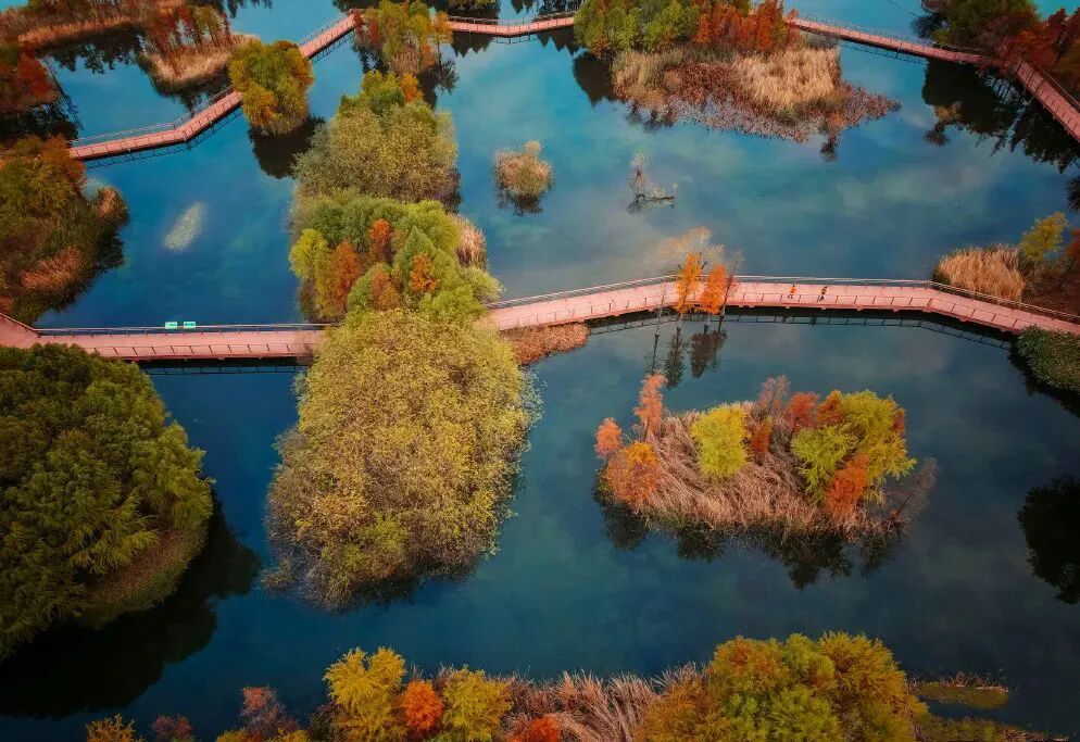 想要感受秋高气爽,定要往太湖边去。鼋头渚的长春桥畔,红枫与万顷太湖碧波相映,景致大气磅礴。沿湖而行,蠡湖国家湿地公园与贡湖湾湿地则是另一番水岸景色。特别是贡湖湾的“水上森林”,池杉与落羽杉层林尽染,倒映如画,是体验生态之美的绝佳去处。