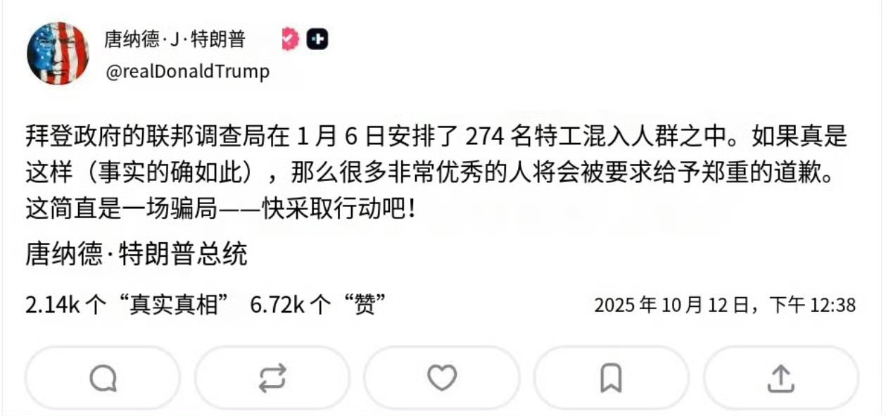 特朗普:拜登当初将274名FBI特工安插进了国会山骚乱中的人群中。[doge]热点观点烽火问鼎计划