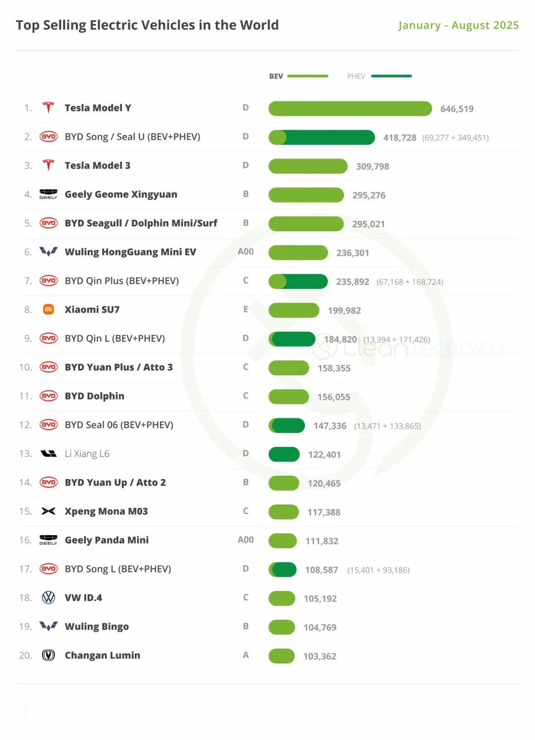 全球纯电动车市场销量报告出炉:8月和1-8月Model Y都是最畅销的电动车