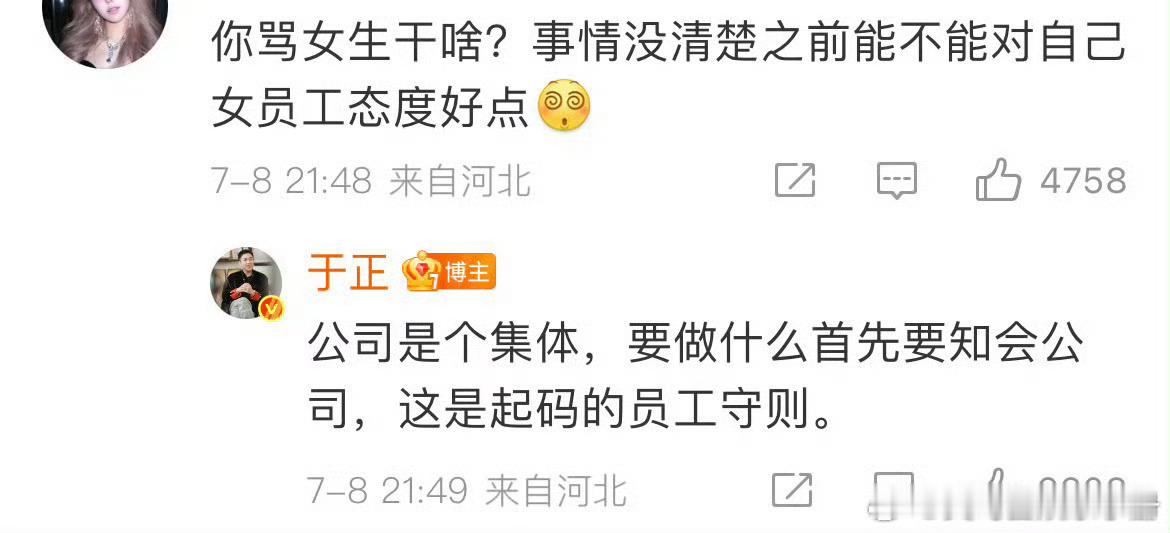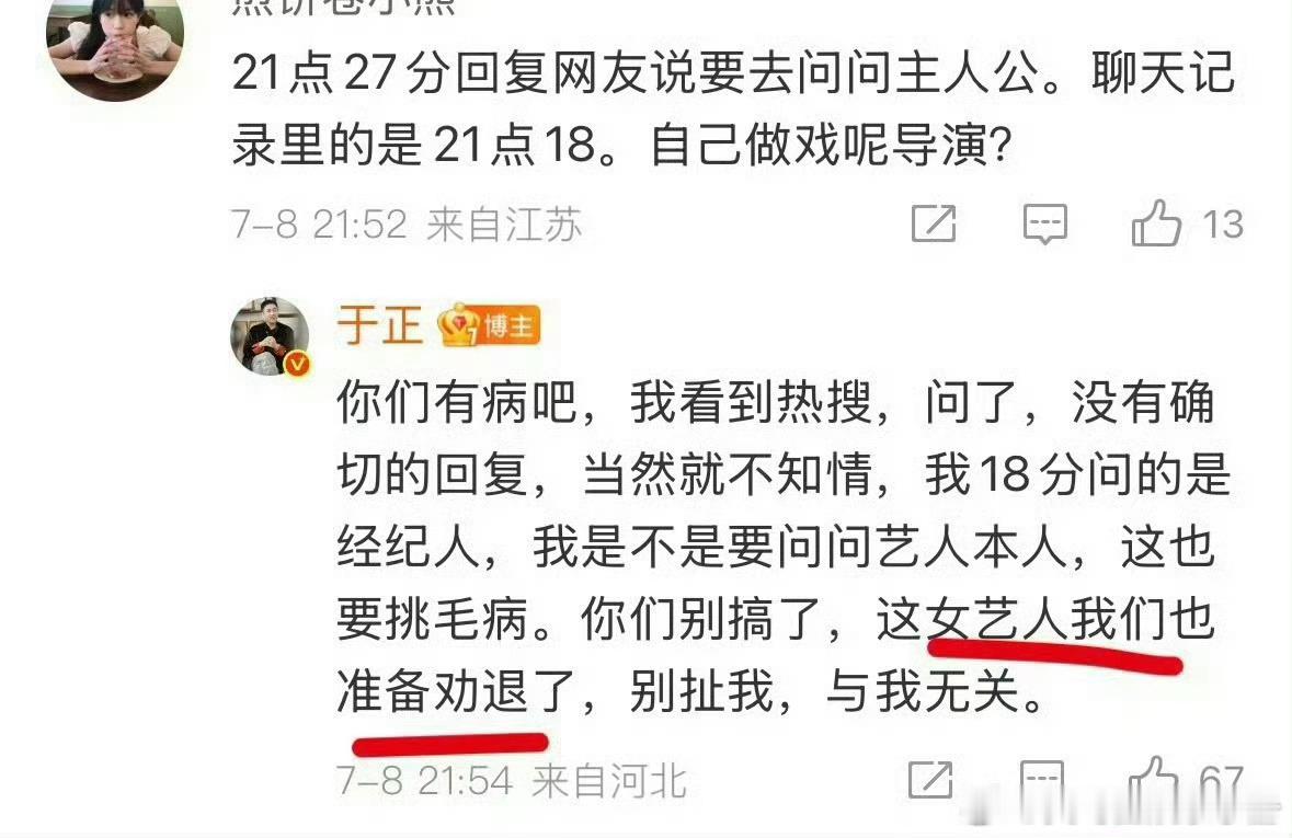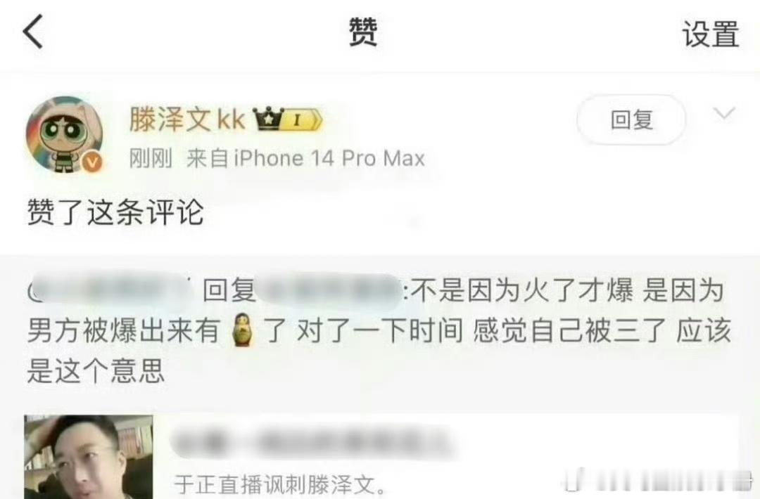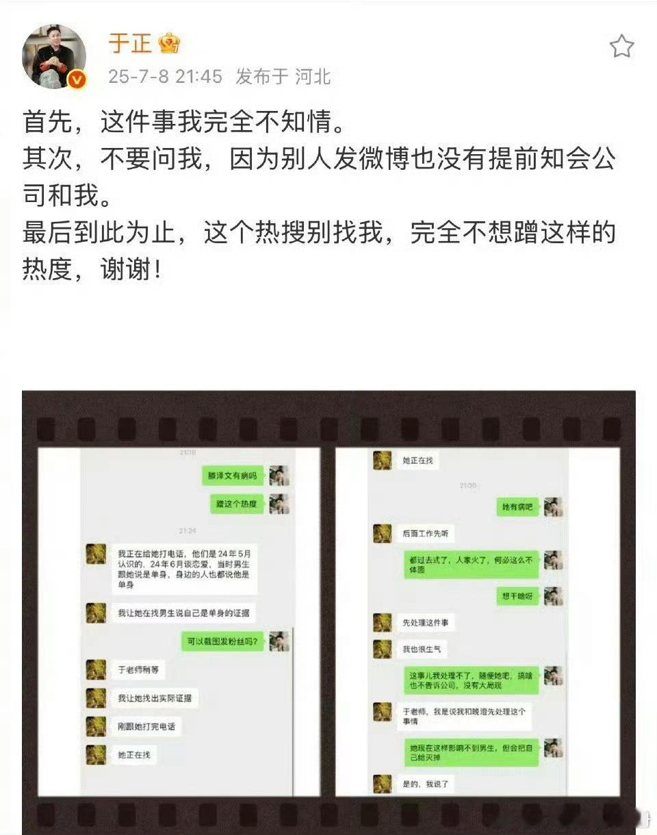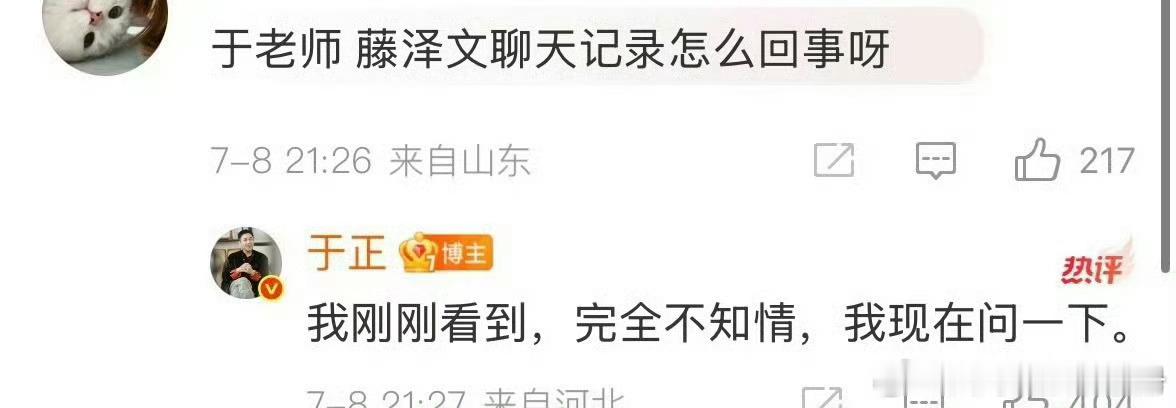 此前滕泽文晒过自己和田栩宁聊天记录,并点赞感觉自己被三的评论,随后于正也下场晒聊天记录询问滕泽文工作人员