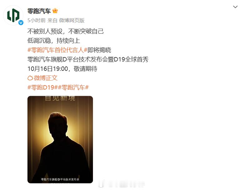 零跑将公布首位代言人10月16日,发博表示,10月16日的零跑D19首秀发布会现场,还将公布首位代言人,看看剪影猜测,首位代言人可能是谁呢[思考]