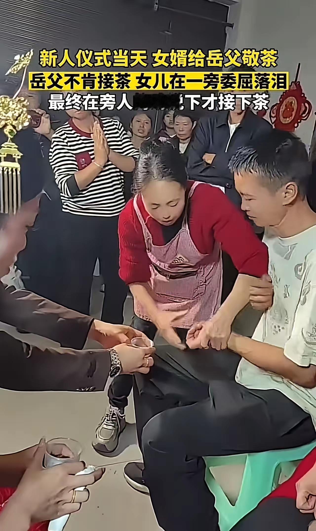 这父亲真是糊涂!女儿结婚,岳父对女婿不满意,在女婿敬茶环节故意不接茶,女儿在一旁委屈落泪,最终在旁人的劝说下,岳父才不情不愿地接下了茶!网友:父亲不是给女婿难看,这是给女儿难看,更给自己难看! 你是否曾经在婚礼上看到过类似的场景?那种尴尬、那份无奈,仿佛一场无声的抗议在空气中弥漫。其实,这不仅仅是一次简单的敬茶仪式,更像是一面镜子,折射出一些家庭关系中深层次的问题。我们常说,婚礼是两个人的事,但更是两个家庭的融合与碰撞。可偏偏,有些“长辈”却用自己的偏见和不满,把原本应该喜悦的日子变成了“战场”。 这位岳父的行为,究竟代表了什么?难道仅仅是对女婿的不满?还是对女儿未来的担忧?答案似乎都在其中,但更深层次的问题是:家庭中的尊重与理解在哪里?我们常常看到,父母对子女的期待变成了无形的压力,而当这种压力转嫁到女婿、甚至孙辈身上时,家庭的和谐就变得岌岌可危。 试想一下,这个场景中的女儿,她的委屈、她的眼泪,是否也曾在无数个家庭中上演?我们每个人都希望自己的婚礼是幸福的开始,但为什么总会有一些“阻力”在其中?难道是传统的束缚,还是家庭成员之间缺乏沟通的阴影?其实,很多时候,问题的根源在于“面子”和“