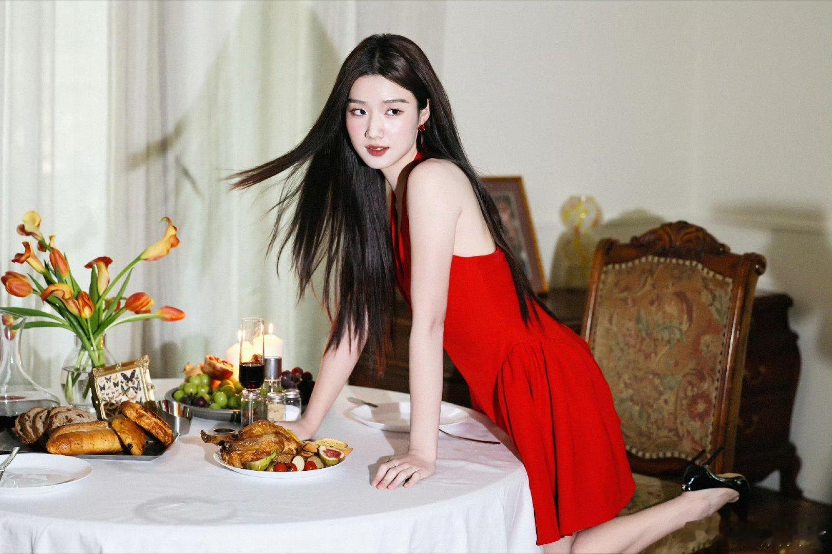 卢昱晓红裙卢昱晓这袭红裙,是误入人间的红玫瑰,热烈又娇俏。挂脖设计衬得肩颈线条优
