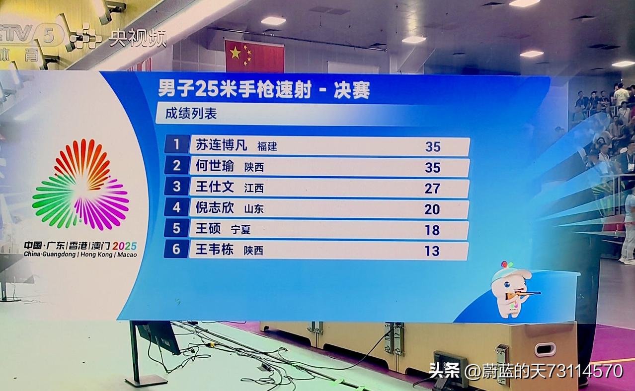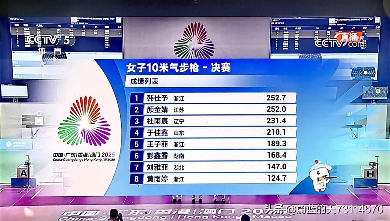 [玫瑰][玫瑰]第十五届全运会射击项目第二比赛日(13日)战报: 一,女子10米汽步枪个人决赛: 冠军:韩佳予(浙江),252.7环。 亚军:颜金婧(江苏),252.0环。 季军:杜雨宸(辽宁),231.4环。 山东于佳鑫、浙江王子菲、湖南彭鑫霜、湖北刘雅菲、浙江黄雨婷,分获第4~8名。 浙江选手韩佳予、王子菲、黄雨婷以1903.6环的总成绩打破该项目1902.0环的世界纪录。 二,男子25米汽手枪速射个人决赛: 冠军:苏连愽凡(福建),35中。 亚军:何世瑜(陕西),35中, 季军:王仕文(江西),27中。