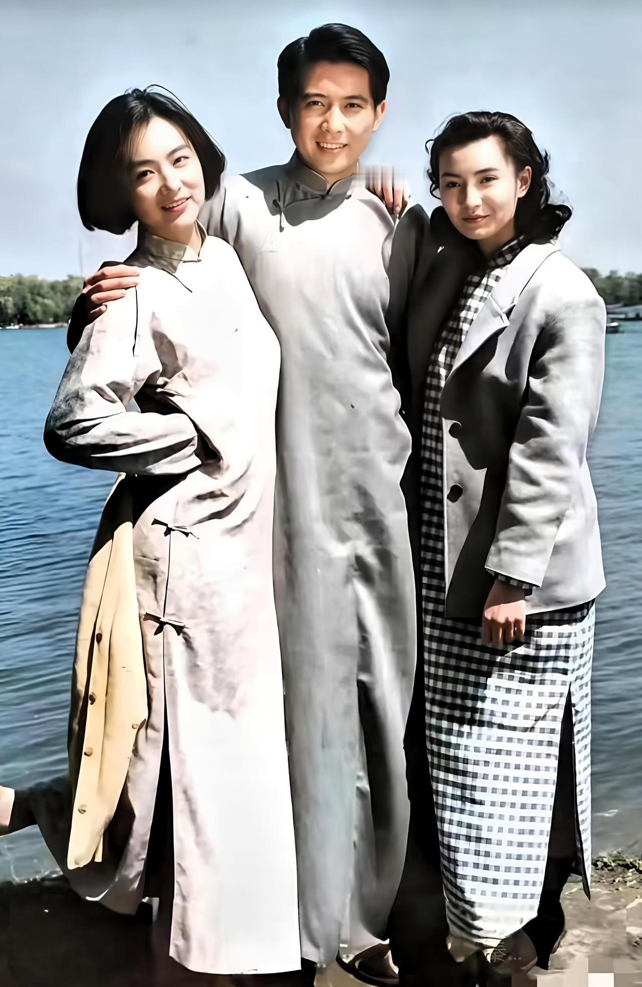 1990年,这是林青霞、张曼玉和秦汉,在电影《滚滚红尘》拍摄间隙合影。三个人都穿