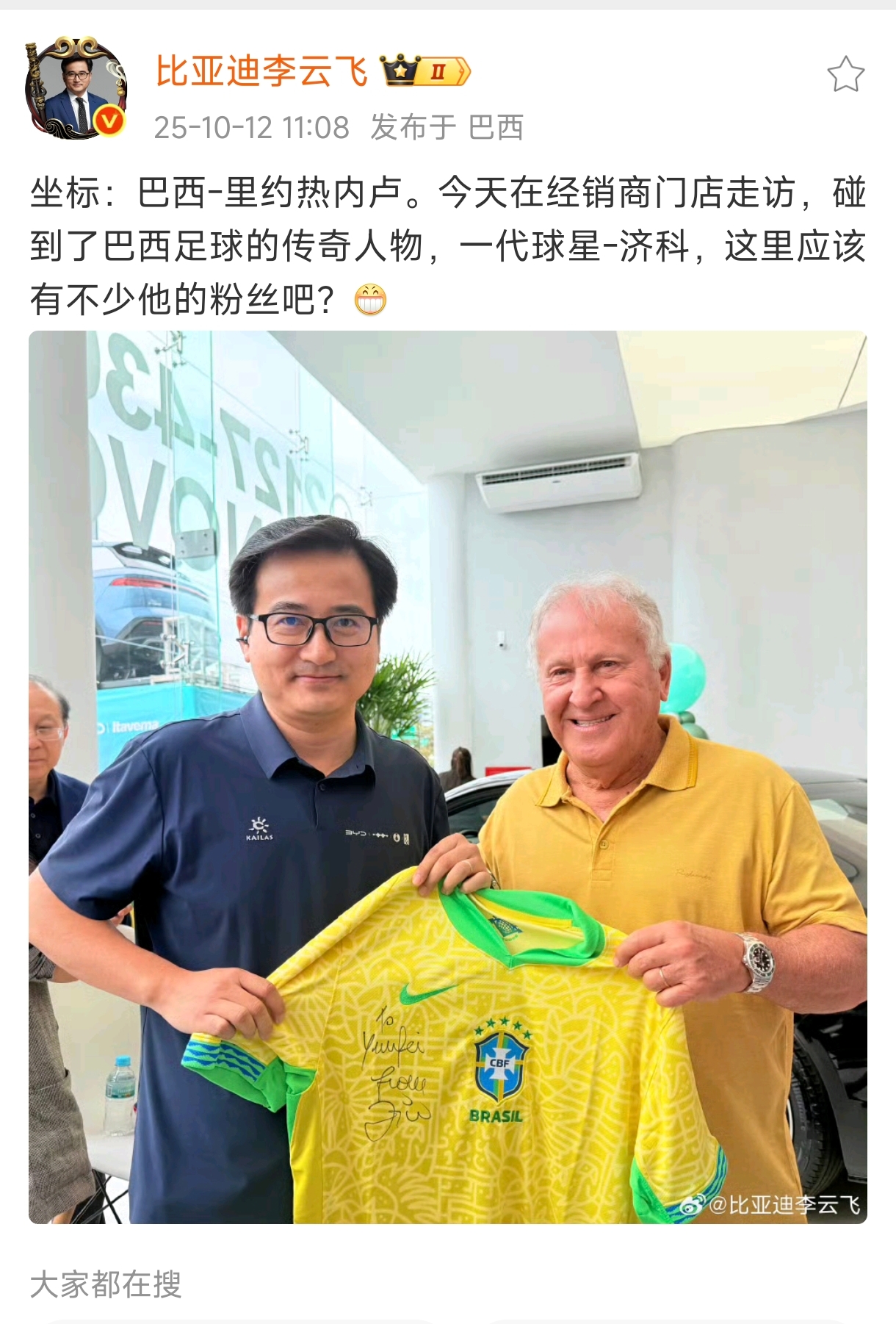 在李云飞那得到消息,活动结束后,在走访当地经销商门店时,还碰到了济科。如果是球迷,对济科肯定不陌生吧,他可以算是巴西足球传奇人物了,号称“白贝利”。当初带领日本国足的时候,没少虐中国男足。没想到这样一个风云人物对比亚迪汽车这么的感兴趣。
