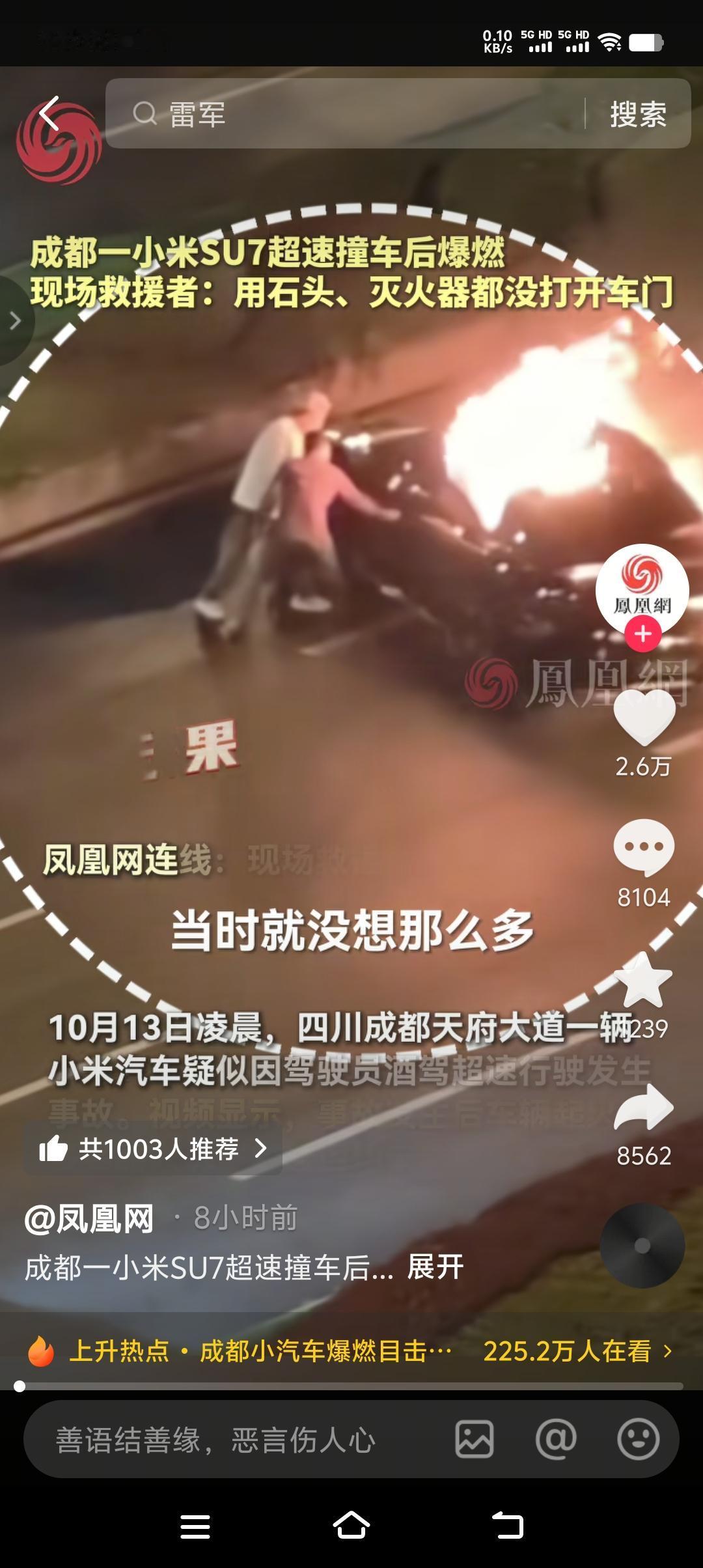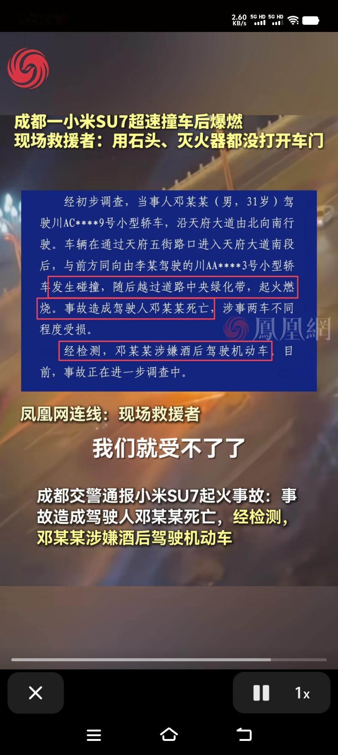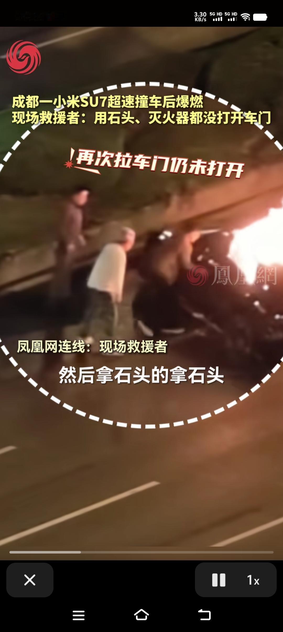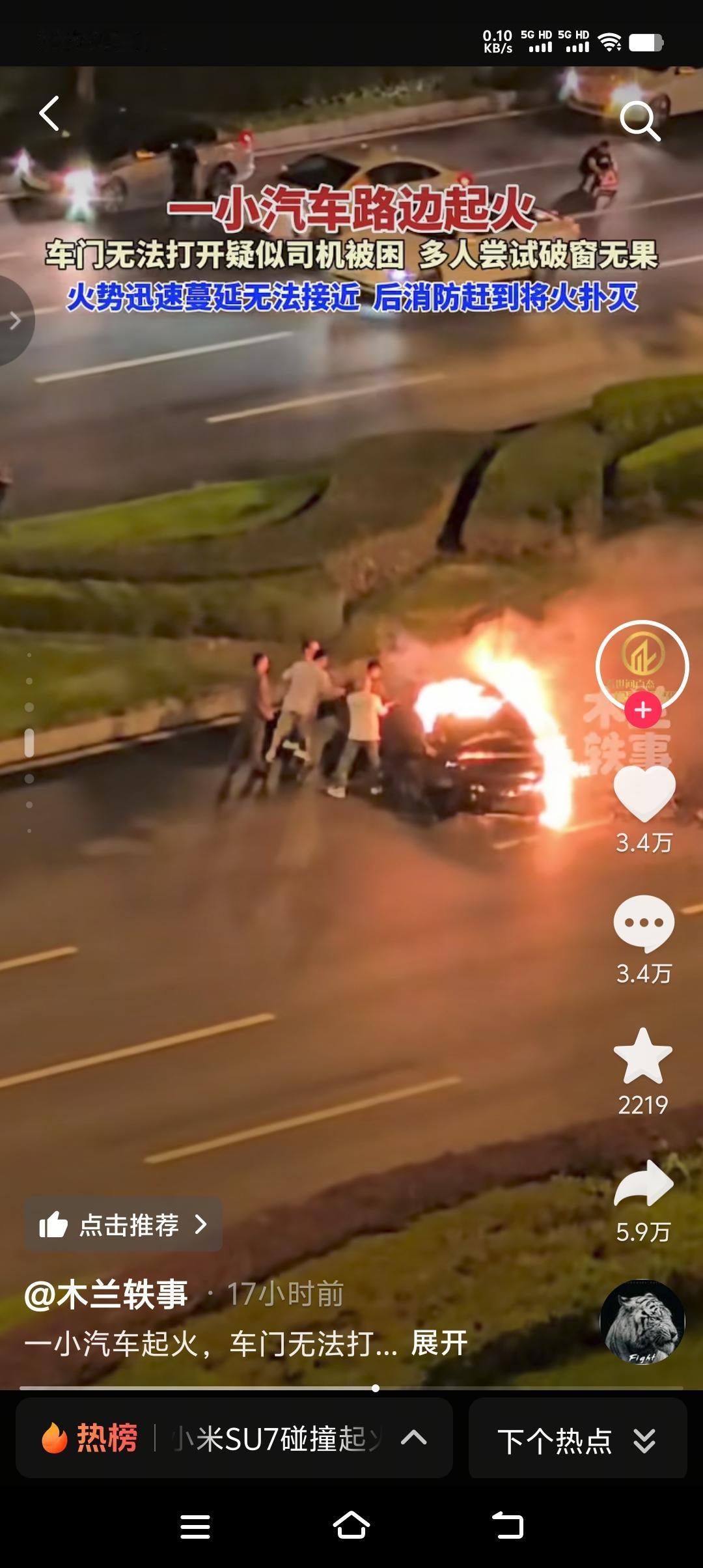后排火光冲天,应该是电池在底盘发生碰撞从下而上燃烧起来的。现场人员又是拽又是踹,灭火器砸,石头砸,还有的情急之下用拳头砸玻璃。司机在里面大吼大叫,也许是出于对死亡的恐惧,也许是被烧的发出了惨烈的尖叫。此时生死之间只隔着一道门,却让现场救援人员束手无策,短短几十秒时间火势蔓延,现场人员根本无法靠近,只能眼睁睁的看着大火吞噬着整个车辆。 司机31岁,涉嫌酒后驾车,在超越前方一辆时速104迈轿车时发生侧翻,瞬间爆炸起火。让我们感到遗憾的是,司机躲过了车祸,却没有躲过大火。该说什么呢?一切理由的理由,都归根于自已无视交通法规。