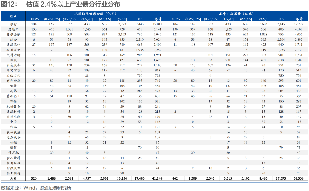 从行业角度来看,估值2.4%以上债券主要分布在银行、房地产、非银金融、综合、建筑装饰、公用事业、交通运输、煤炭等行业。