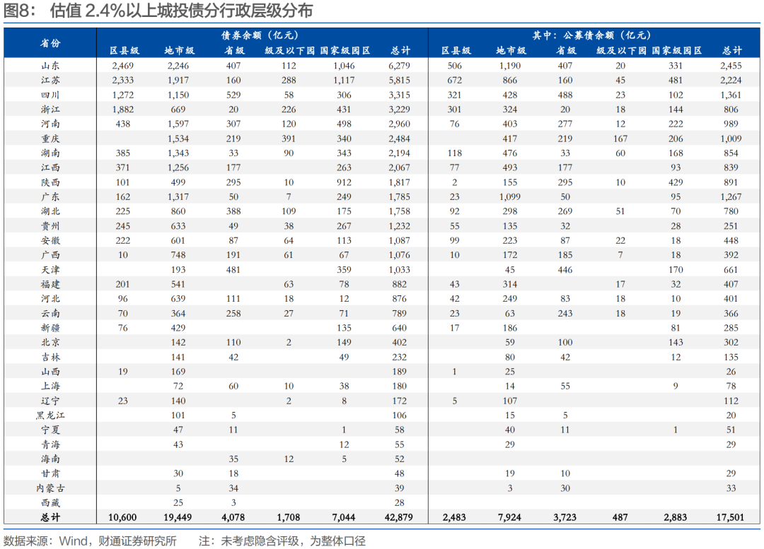 省份层面,山东、江苏、四川、浙江、河南、重庆、湖南、江西等省份2.4%以上债券存续规模较高。更具体来看,山东、江苏、四川主要存在于区县级和地市级主体,浙江主要是区县级主体,重庆散布于各辖区,河南、湖南、江西区县发债较少,主要集中于地市级。