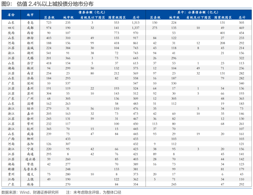 地市层面,青岛、成都、西安、潍坊、郑州、盐城、湖州、无锡、济宁等地市2.4%以上城投债存续规模较高。