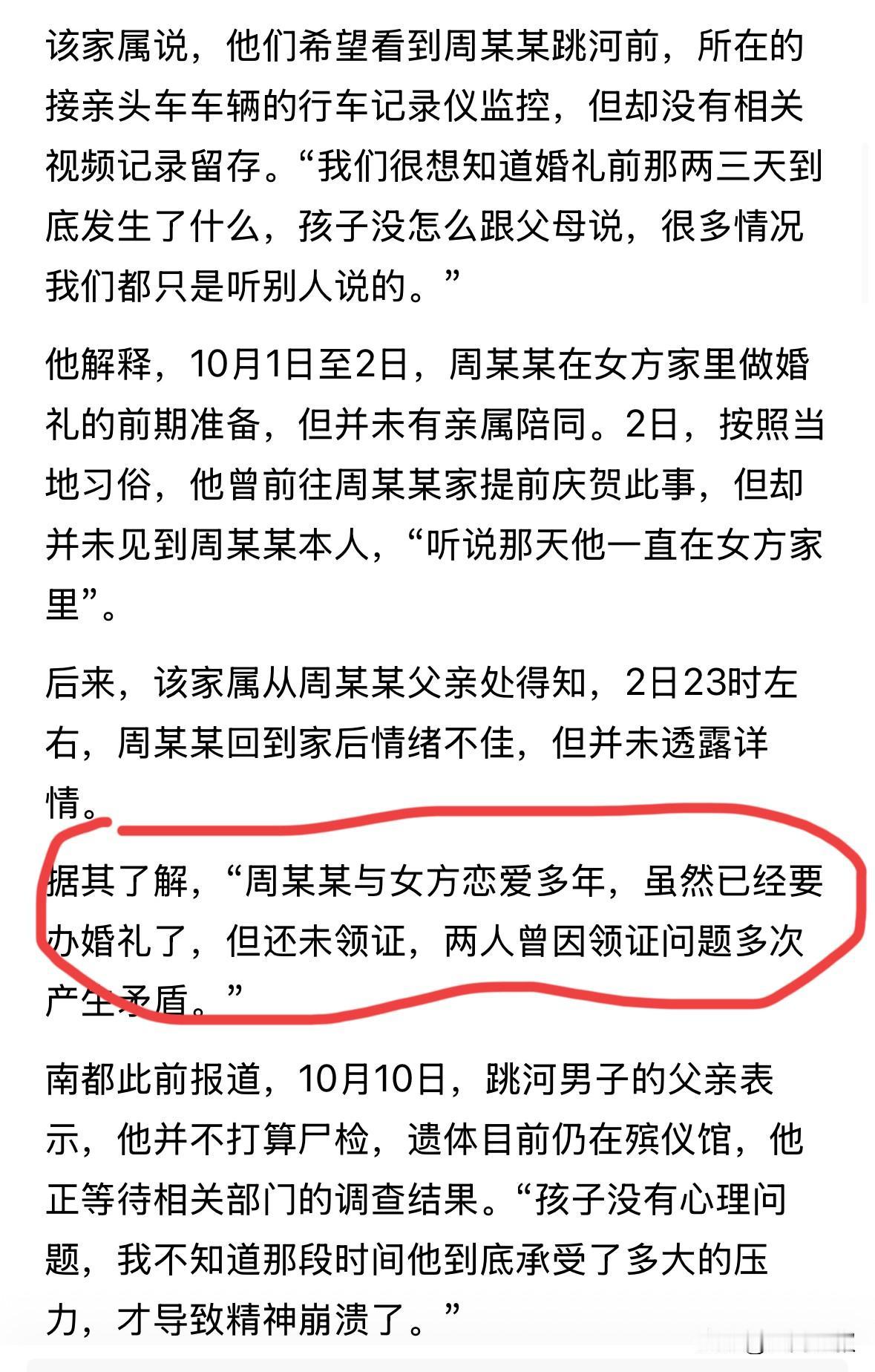 陕西跳水新郎家属再发声 原来婚礼前新郎新娘还没领证。有点不懂,俩人并不是闪婚,恋爱也挺多年了,还两年前就订婚了,怎么会婚礼前还没领证呢?看到这最新的后续,3号的婚礼,新郎1号2号一直在女方家里忙婚礼的事,2号回到自己家都夜里11点了,回到家情绪就不好,倒有点说的通了,如果之前一直很开心,真不至于当天因突发事件选择走这条路,只能说是压抑的情绪积在一块了。结婚前不应该各自在家准备吗,怎么在女方家忙到那么晚,我记得自己结婚时,前几天都没见面了,因为他们那边也要忙,我们这边也要忙,直接各准备各的,有事电话沟通。 看着结果主要原因还是经济问题,哎,这男孩子太能扛了,有憋屈说不出来,估计家里为了结婚真掏空了吧,妈妈至今躺在医院,新郎的遗体还躺在殡仪馆,男方家里想看行车记录仪了解到底发生了什么,结果视频也没有留存,希望早点有结果,母亲能慢慢走出来,男孩也早日入土为安。