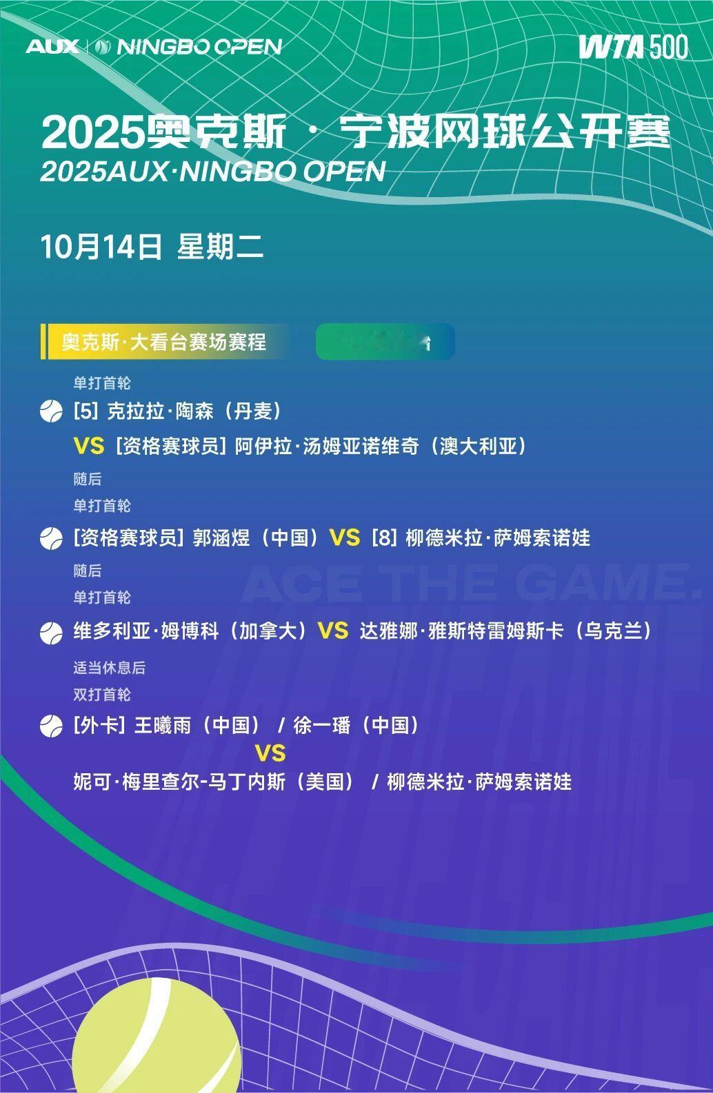 10月14日,2025奥克斯·宁波网球公开赛将继续首轮争夺,宁波(鄞州)网球中心的中心赛场好戏连台: