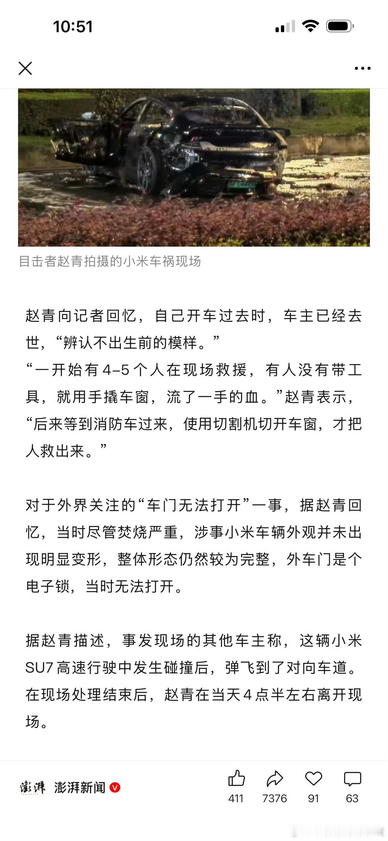 电子门锁依赖小电瓶解锁,如果当时剧烈碰撞、飞到对向车道,导致小电瓶受损了,门极有可能打不开的。