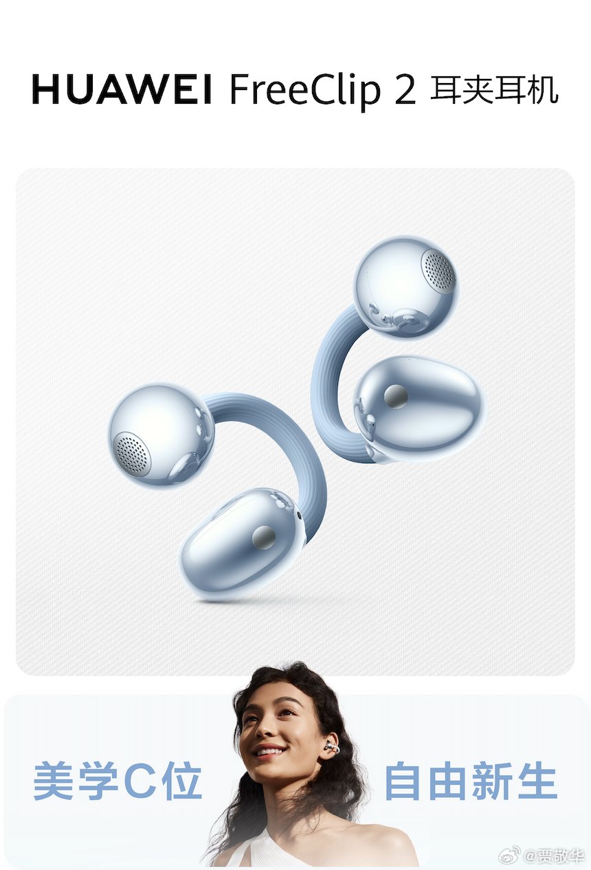 其实,华为蓝牙耳机经常亮相国际时装周,采用全新亲肤液态硅胶材质与高弹性记忆金属的华为FreeClip 2耳夹耳机,打造云感C形桥设计,单耳重量仅5.1g,实现真正无感佩戴。