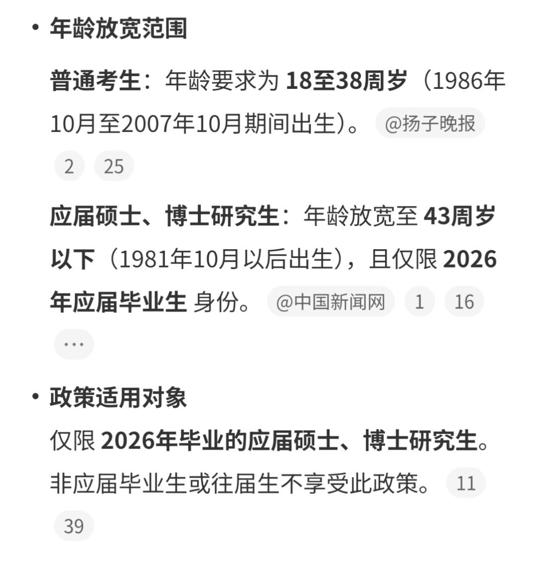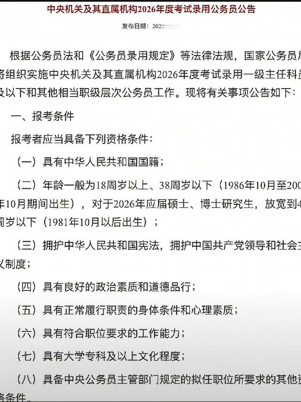 国考年龄放宽到38岁你还真别说,当初我刚大学毕业也有一颗想考公的心,奈何考了一次国考一次省考后彻底放弃了!考前自信满满,看到考题瞬间心态崩了~能在35-38岁这个年龄段还去考的,无非是想换个环境或谋求更好的机会[二哈]应届硕博生国考年龄放宽到43岁
