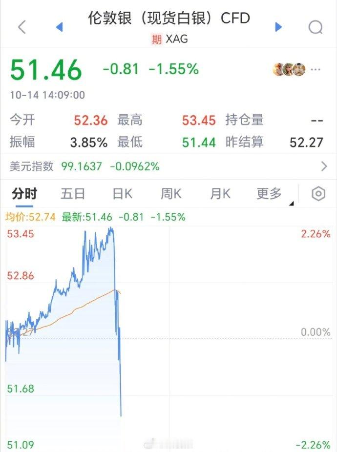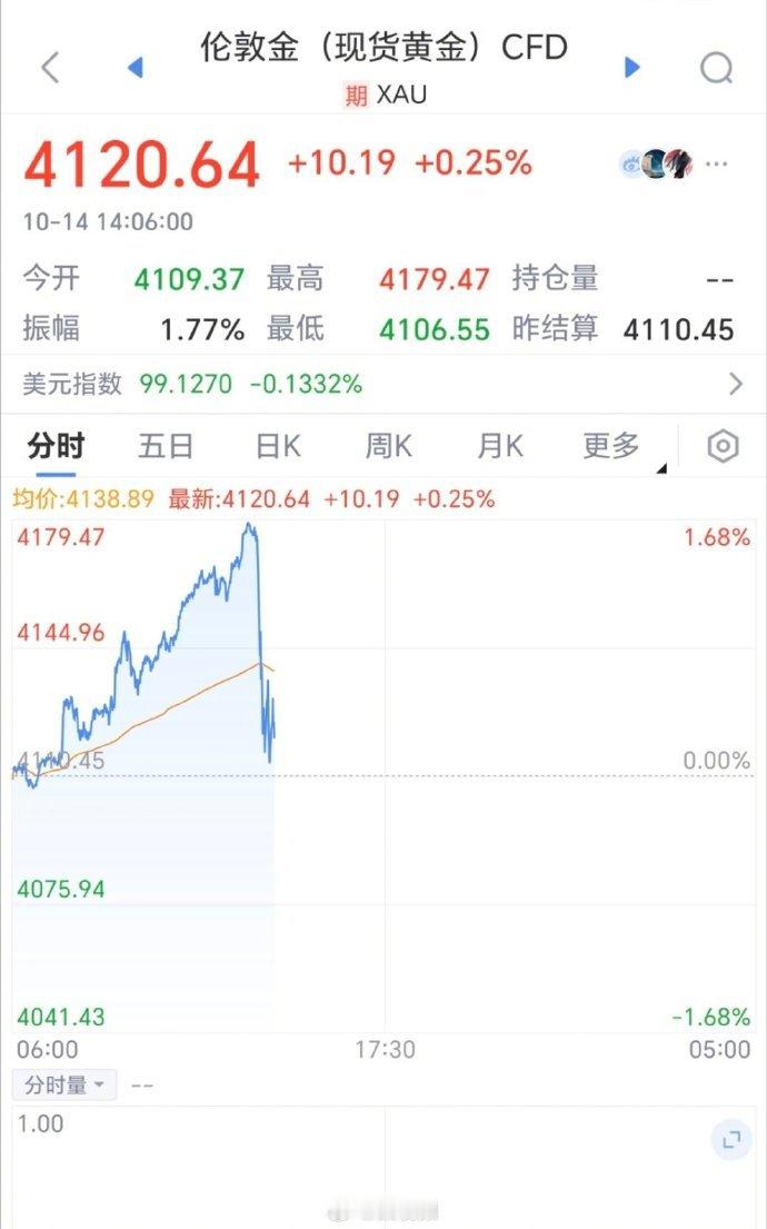 金价银价跳水10月14日午后,现货黄金短线急跌超40美元,白银跌1.7美元,沪银