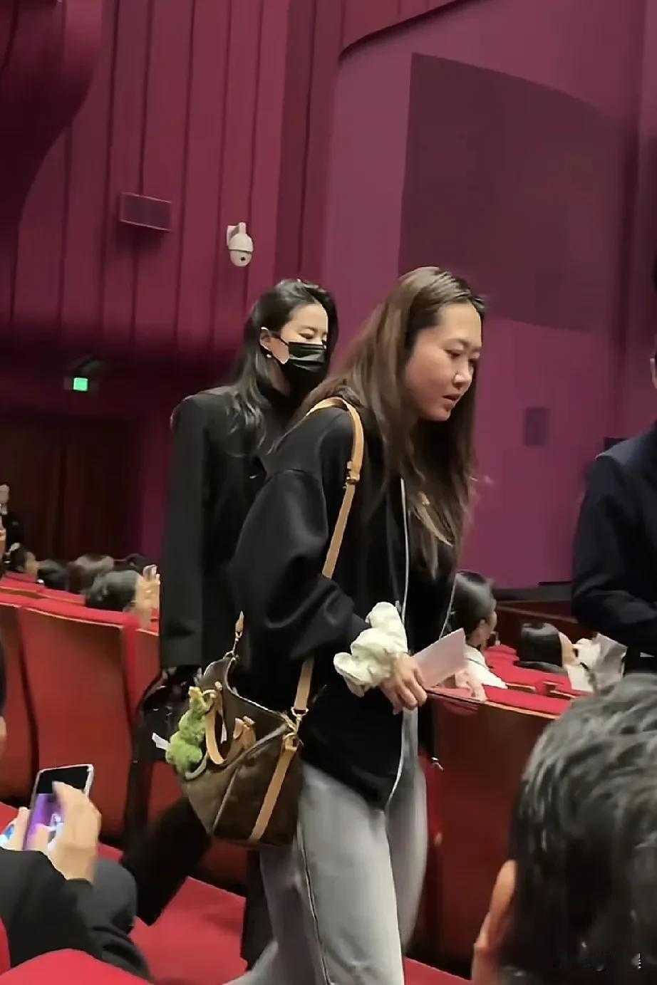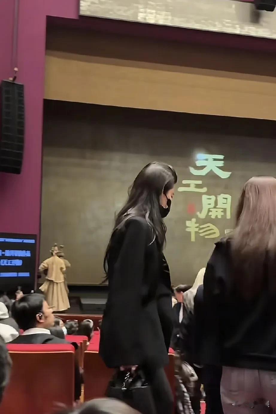 礼堂红椅旁,刘亦菲黑色衣装简约,看舞台剧