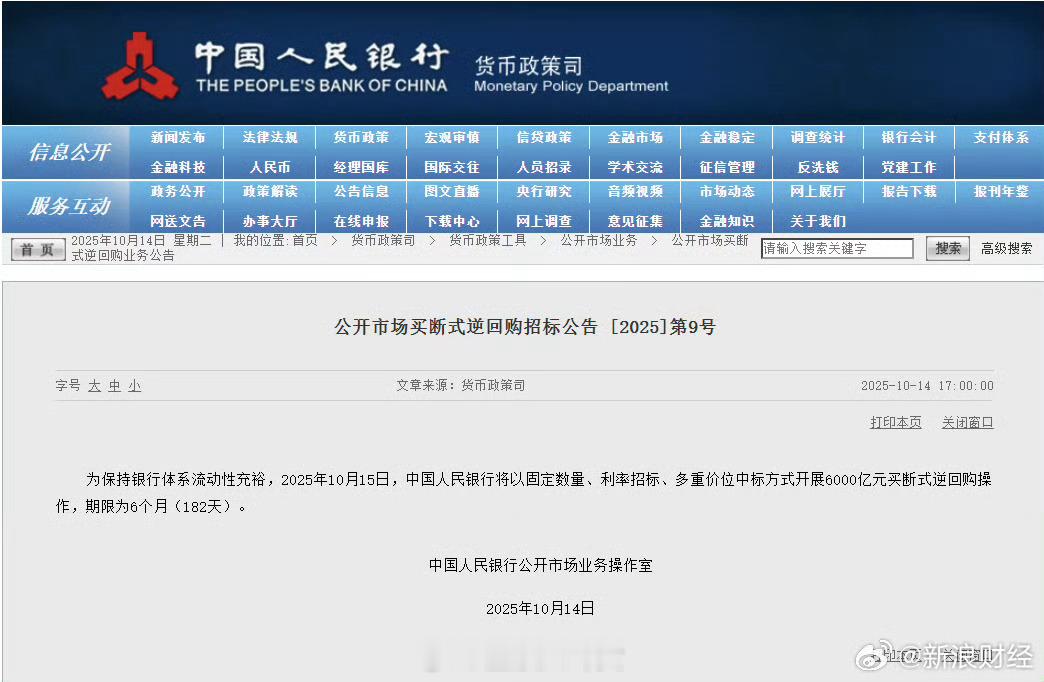 央行明日开展6000亿买断式逆回购操作央行发布公开市场买断式逆回购招标公告,2025年10月15日,中国人民银行将以固定数量、利率招标、多重价位中标方式开展6000亿元买断式逆回购操作,期限为6个月(182天)[并不简单]