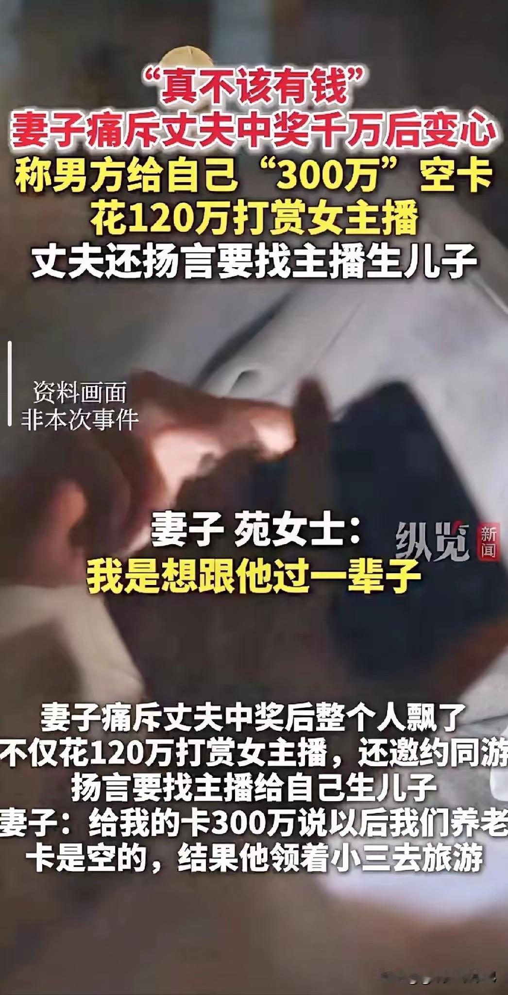 到底是人的问题还是钱的问题?男子彩票中奖千万元后变“飘”了:打赏女主播120万元且跟主播同游。面对妻子的不满,男子直言要跟女主播生儿子! 更气人的是,男子留给妻子的300万元银行卡竟然是空的,压根没有钱!!! 难道真是应了那句话“男人有钱就变坏”?彩票中奖后遗症 千万元巨奖 十万元大奖球赛
