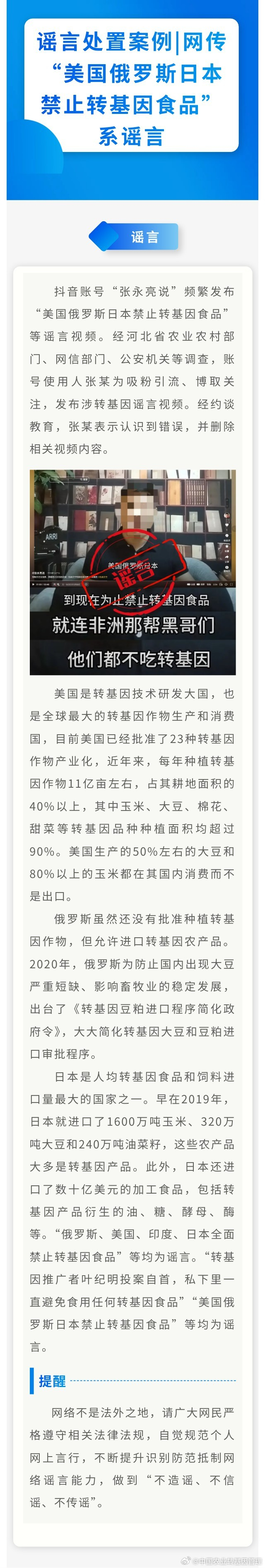 #美日俄禁止转基因食品系谣言#【#男子发布转基因相关谣言被约谈#】据:抖音账号“张永亮说”频繁发布“美国俄罗斯日本禁止转基因食品”等谣言视频。经河北省农业农村部门、网信部门、公安机关等调查,账号使用人张某为吸粉引流、博取关注,发布涉转基因谣言视频。经约谈教育,张某表示认识到错误,并删除相关视频内容。