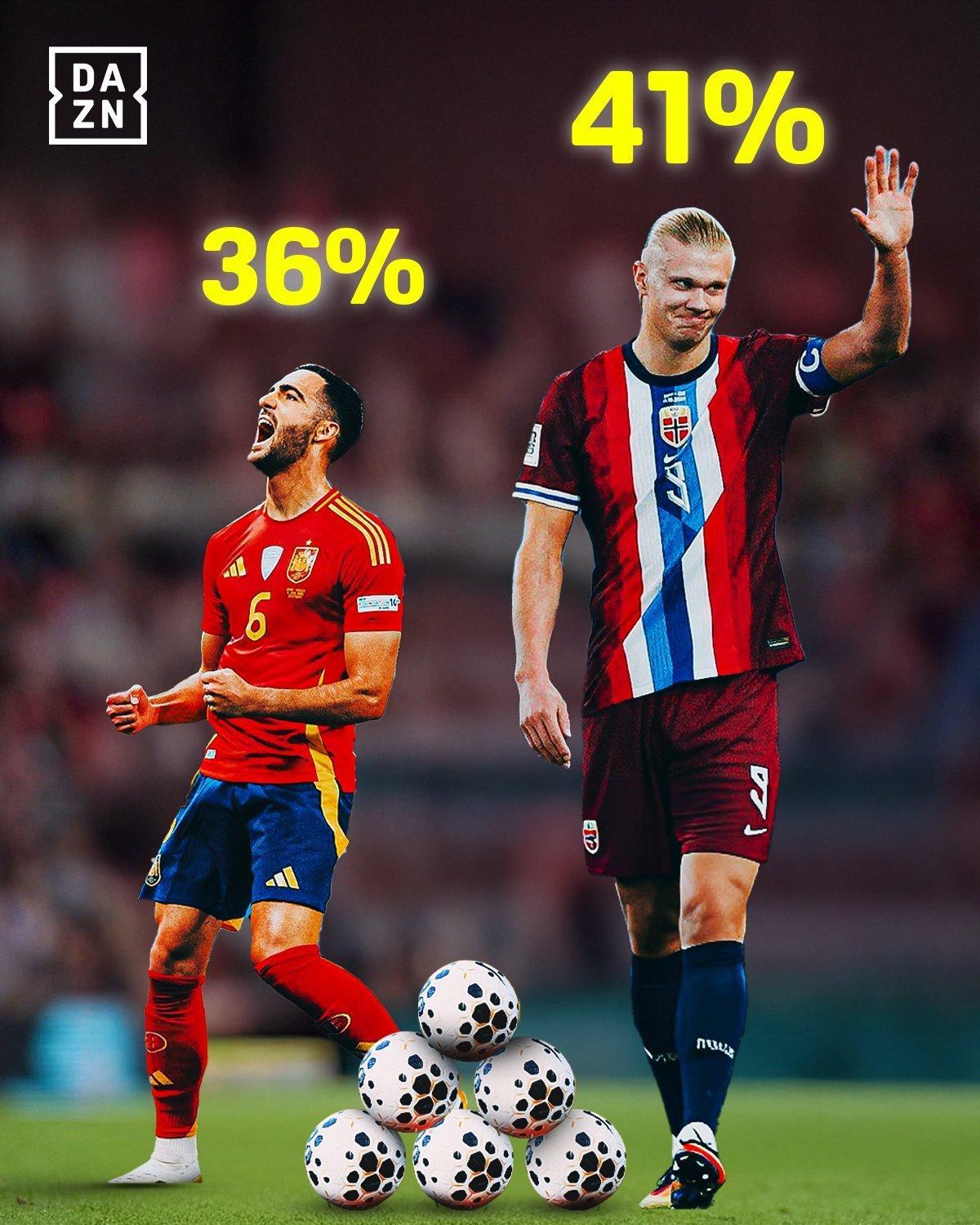 迄今为止,梅里诺的进球占了西班牙的36%(4/11),这个比例在欧预赛所有球员中只比哈兰德(41%,12/29)低。
