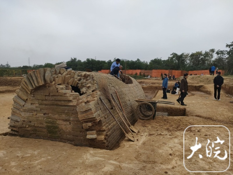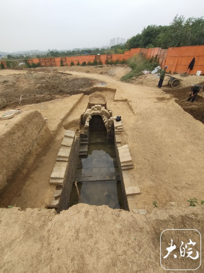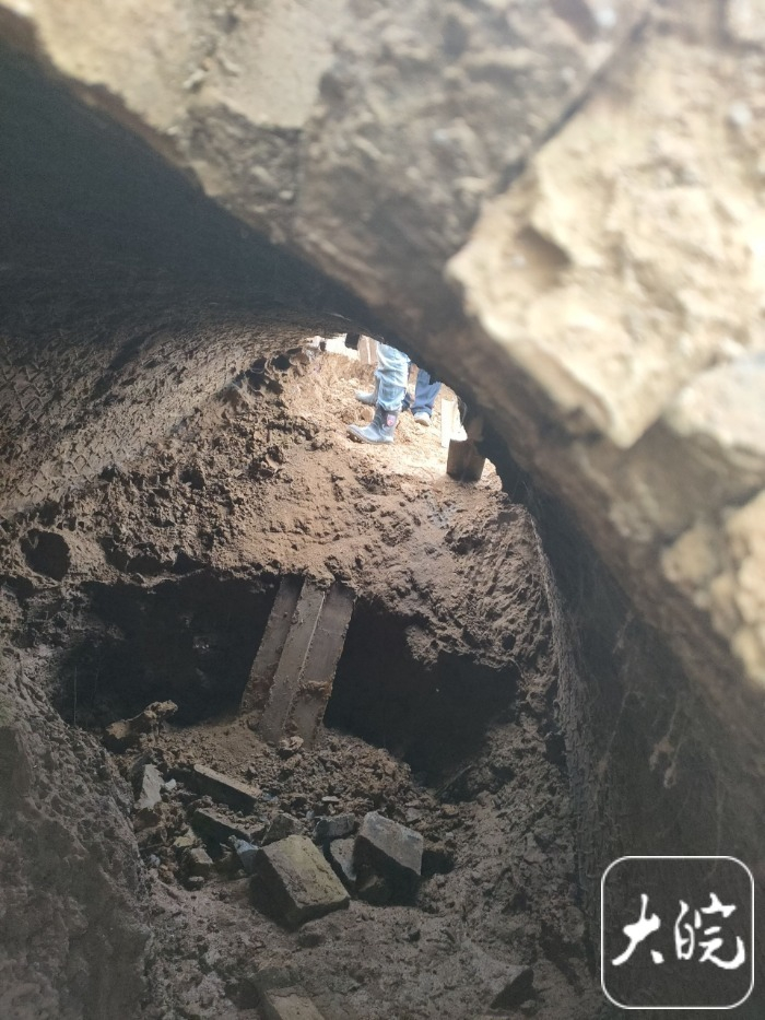 大皖新闻记者在现场看到,东侧大墓形制特别,墓室、耳室、甬道都保存相对完好,初步判断墓葬主人地位较为尊贵。令人惋惜的是,考古人员发现墓顶有两处明显的盗洞,盗洞里有蛇皮袋、雨衣等物,还有一个矿泉水瓶。据现场村民介绍,盗洞虽然存在,但被植被覆盖,直到今年1月,农田改造平整时,古墓一角墓砖被挖掘机挖坏,这才发现了古墓。