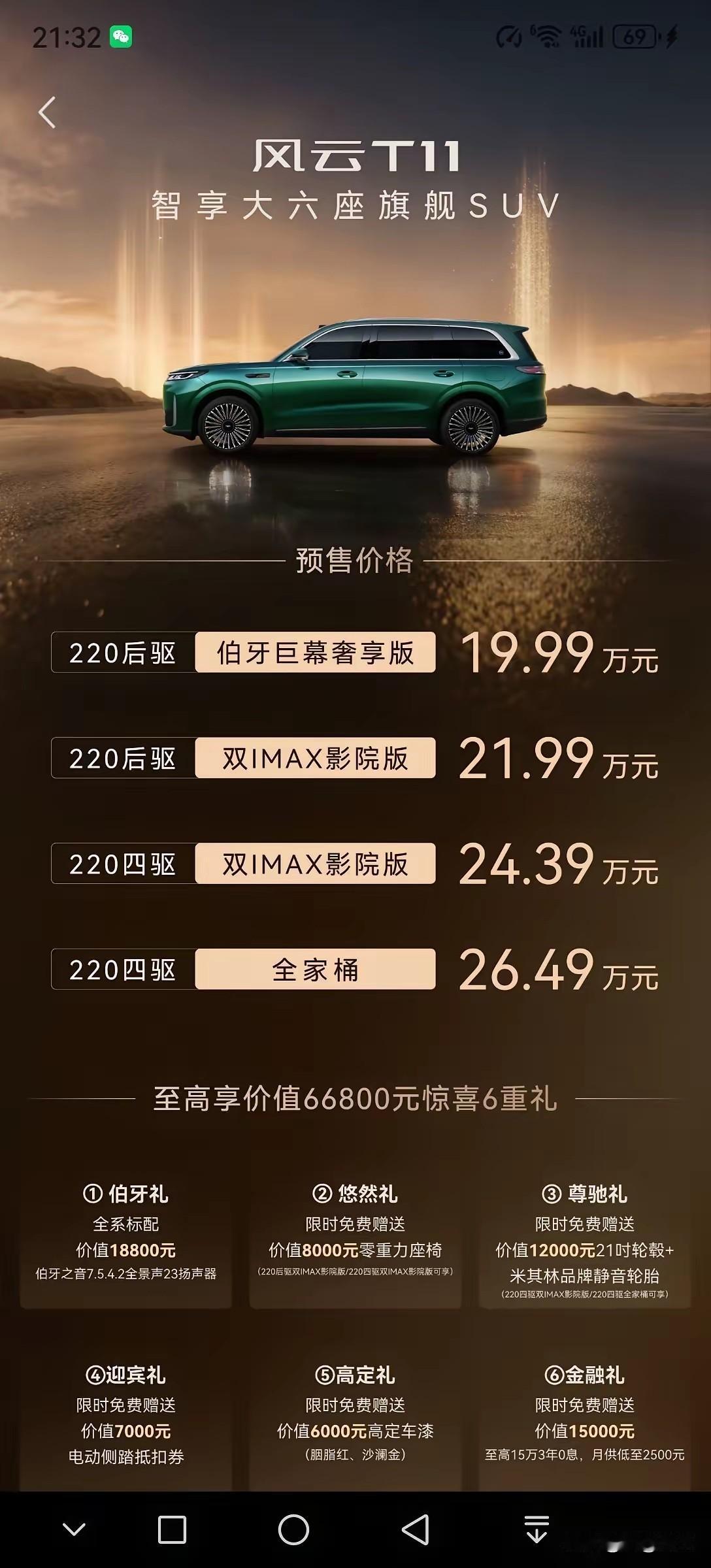 小编发现,奇瑞新款大型suv风云T11预售开启。最低只要19.99万元!预计正式上市还会便宜1万左右,这个车非常有性价比! 整车是增程式,空间非常大,轴距3120mm,是一个六座车型。非常适合全家出行! 针对此车,符合大家的预期和心理审美吗?