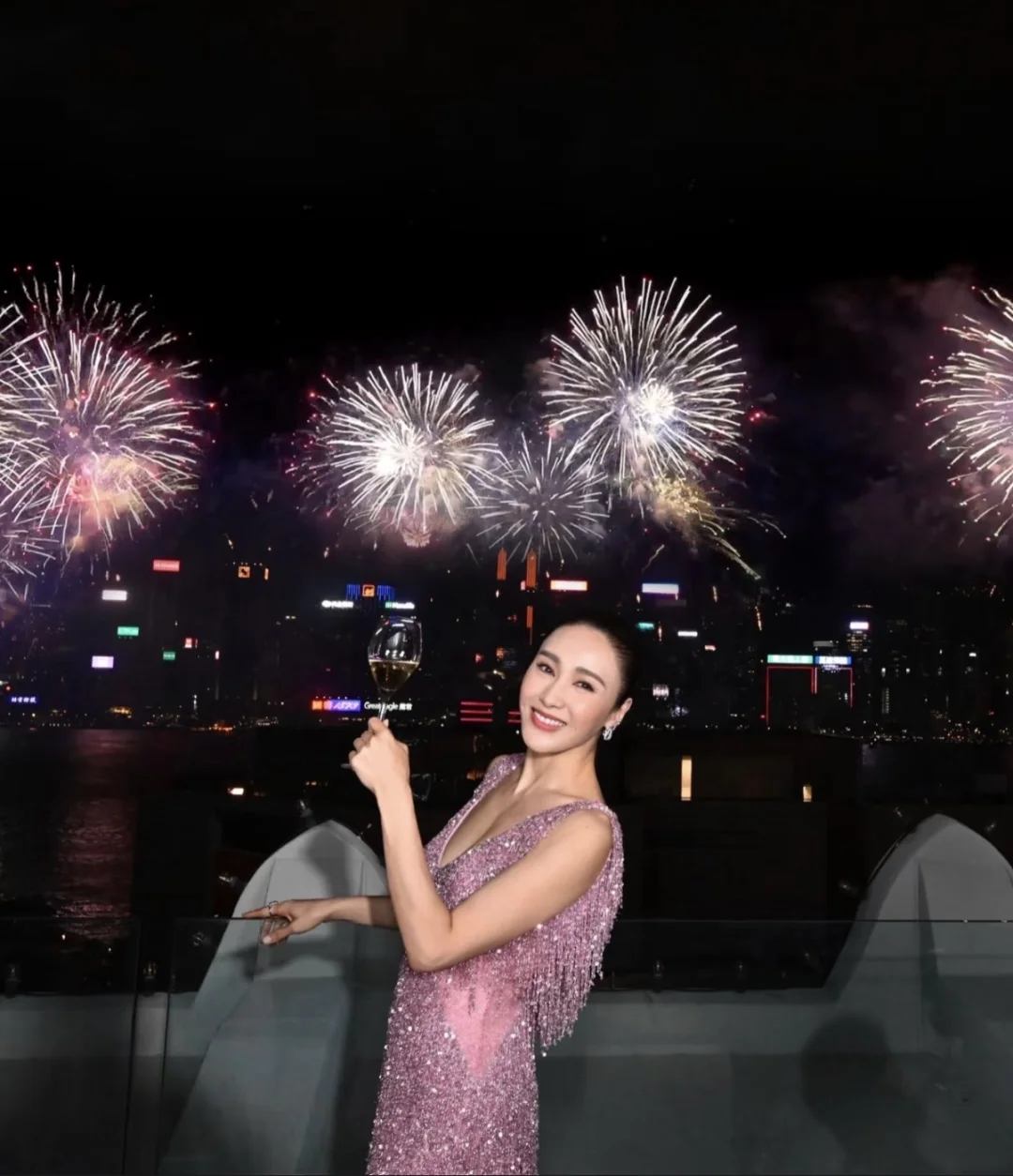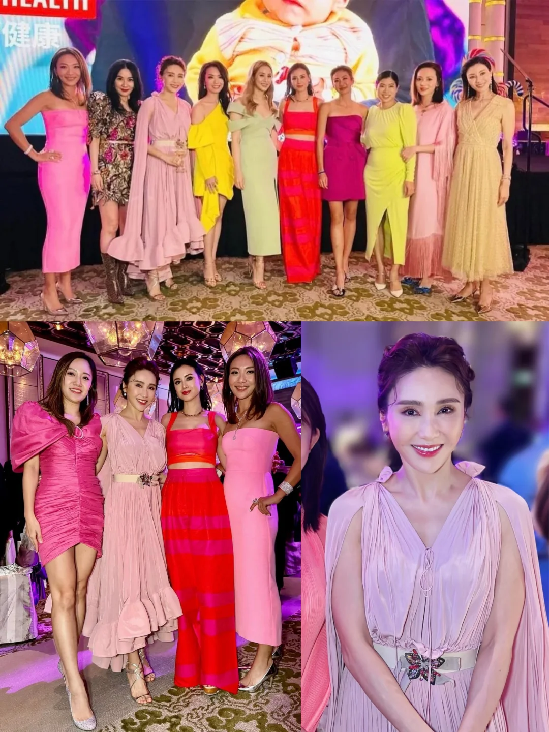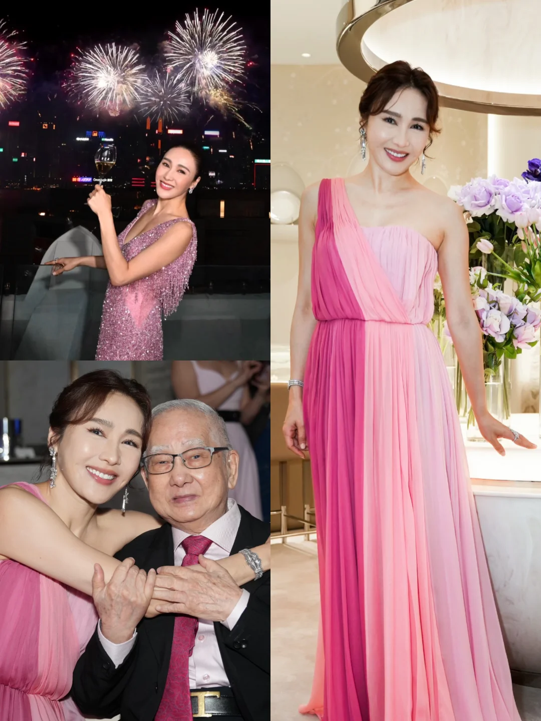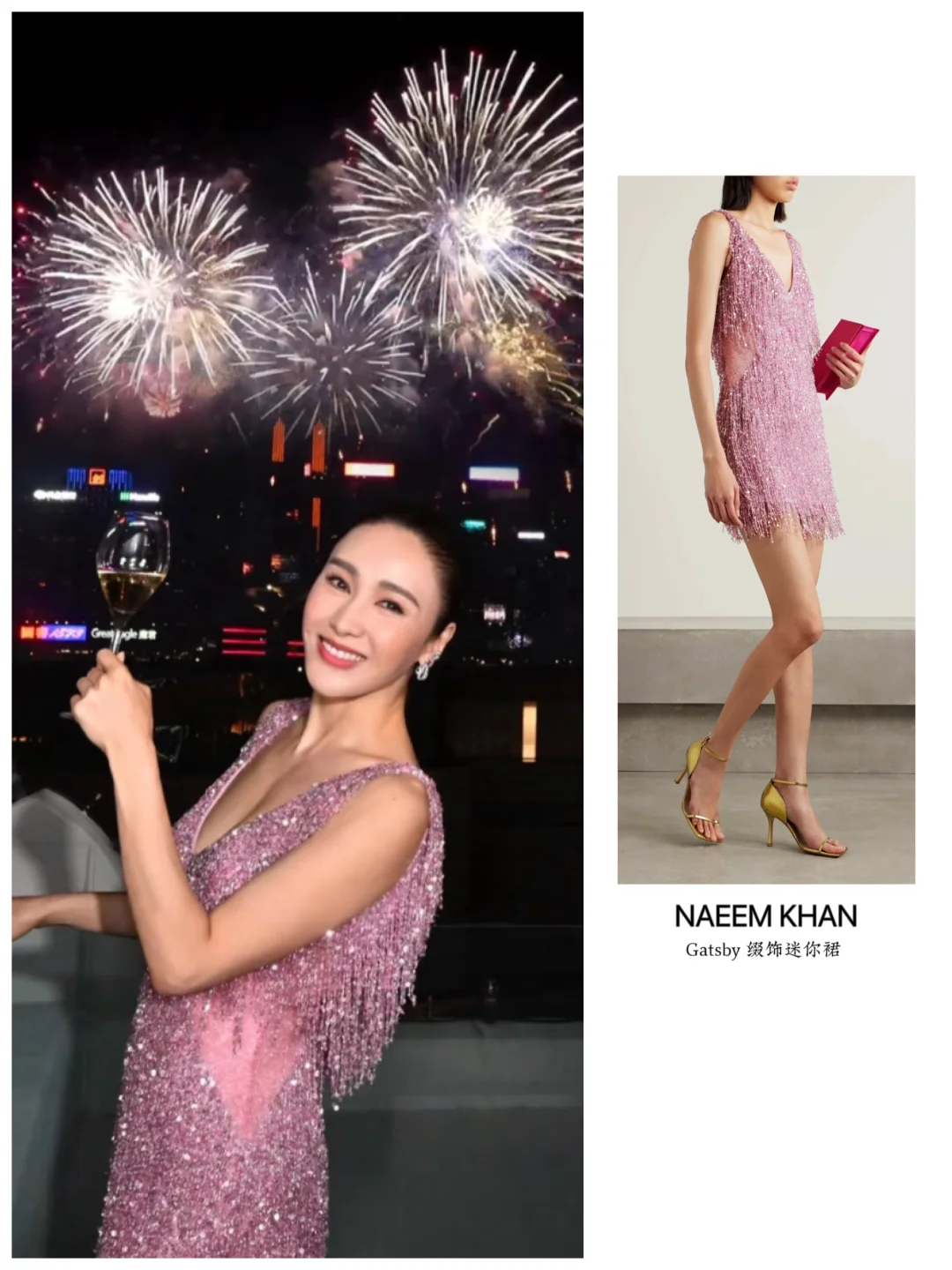 之所以说“也”,是因为她去年庆生和家人看维港烟火穿的也是粉裙,去年是一条bling bling的流苏裙,搭配高级珠宝,同样美丽!