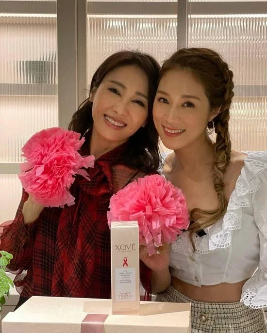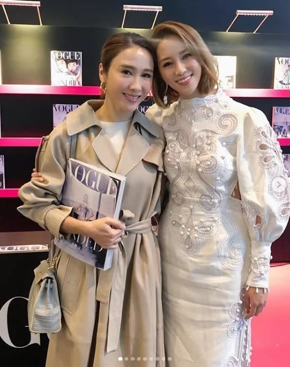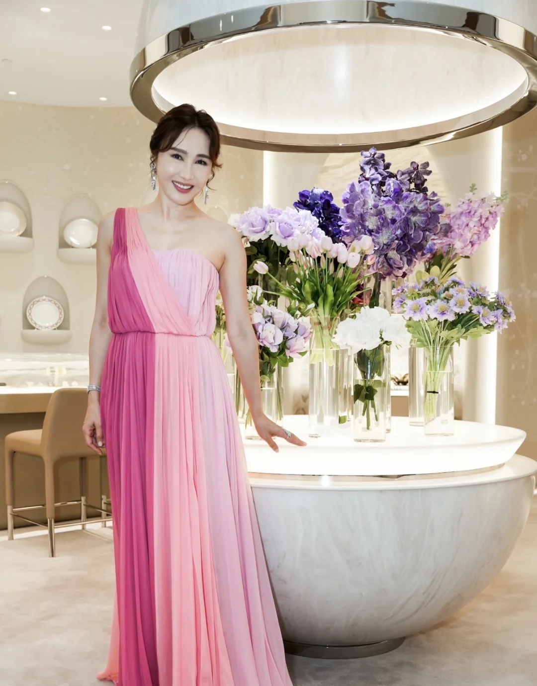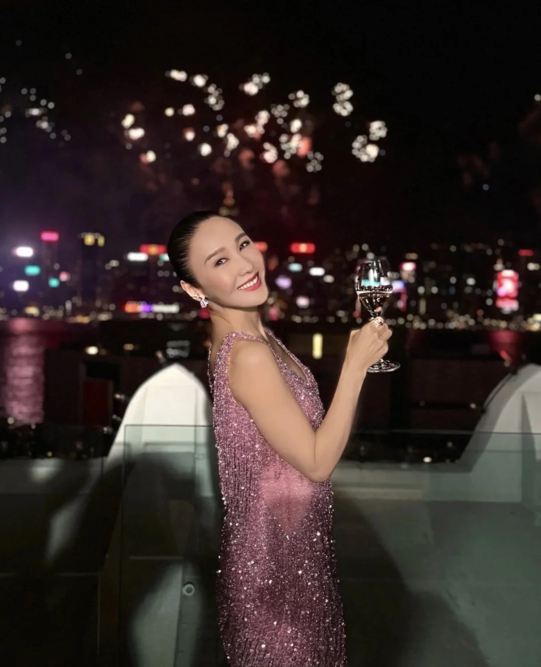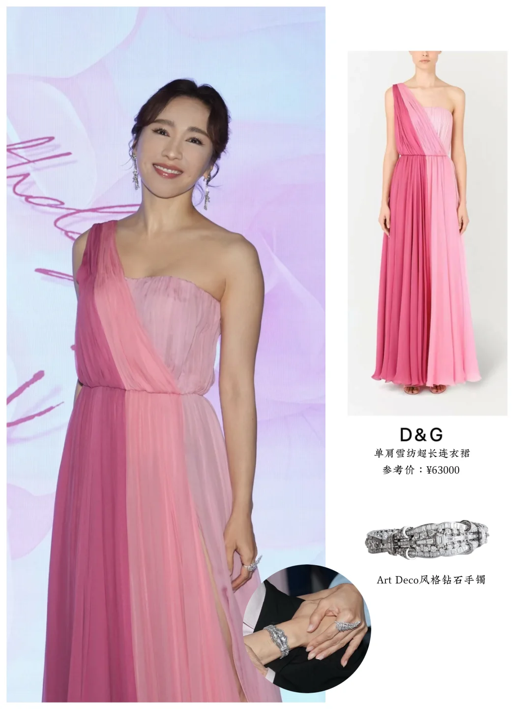 之所以说“也”,是因为她去年庆生和家人看维港烟火穿的也是粉裙,去年是一条bling bling的流苏裙,搭配高级珠宝,同样美丽!