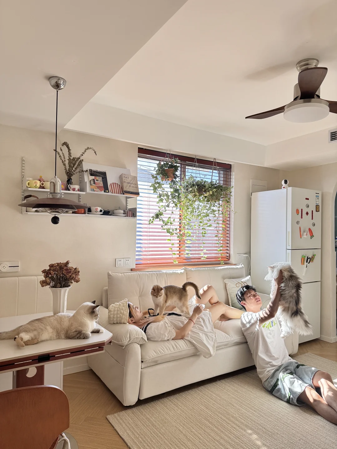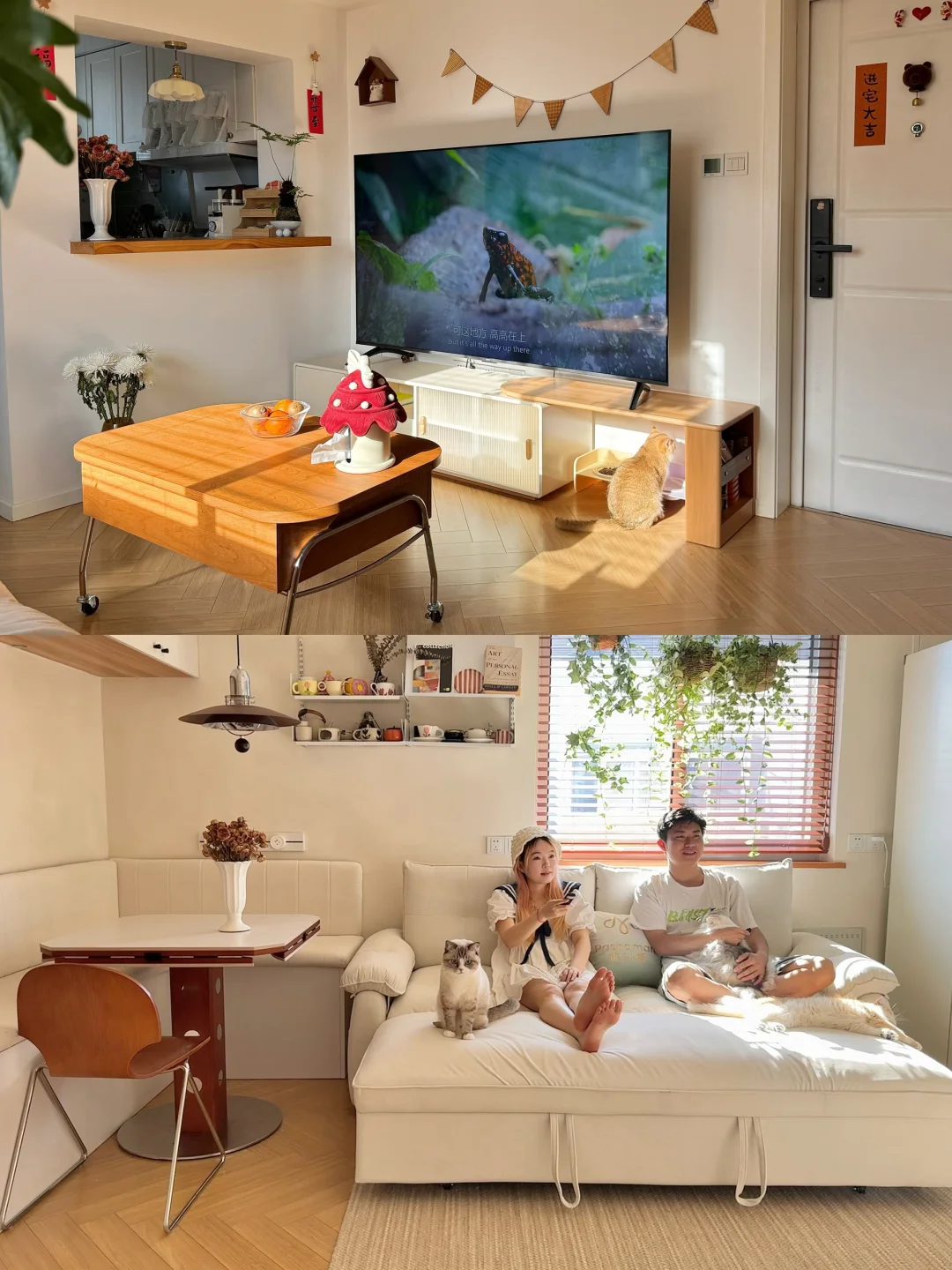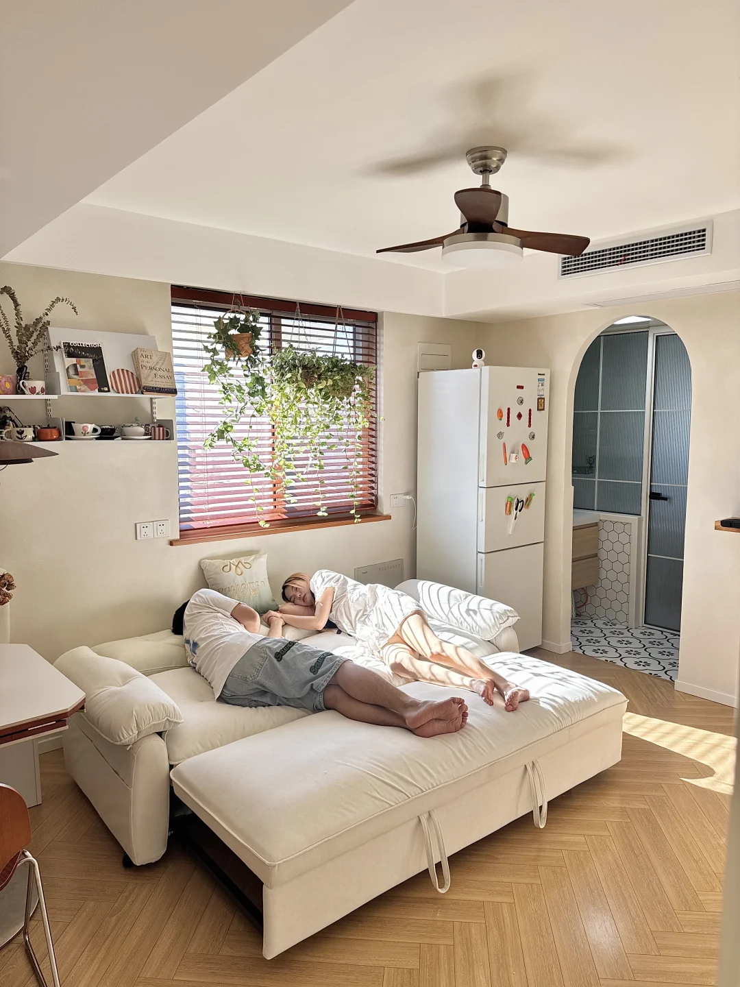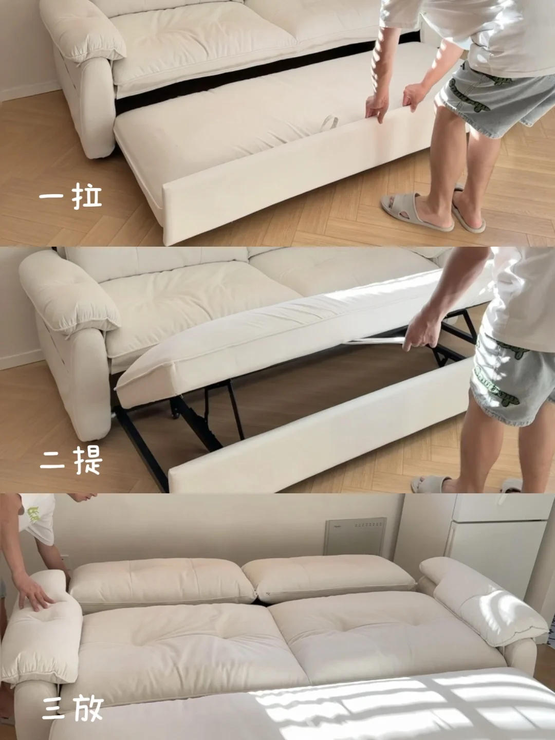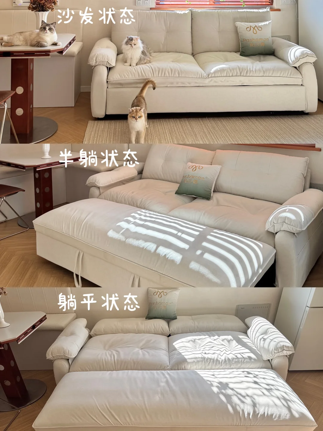 2米的小身材,放在小客厅里,一点也不占地方。平时就是一个大两人座的沙发🛋️。我和老公看电视📺或者看投影时,它是我和老公的追剧好搭子。把它拉开,就摇身一变,变成了一个大大的躺椅,靠着葛优躺看剧,超舒服~家里来客人了,只需要一提二拉三放,沙发秒变一张床🛏️!睡💤两个人丝毫不在话下~