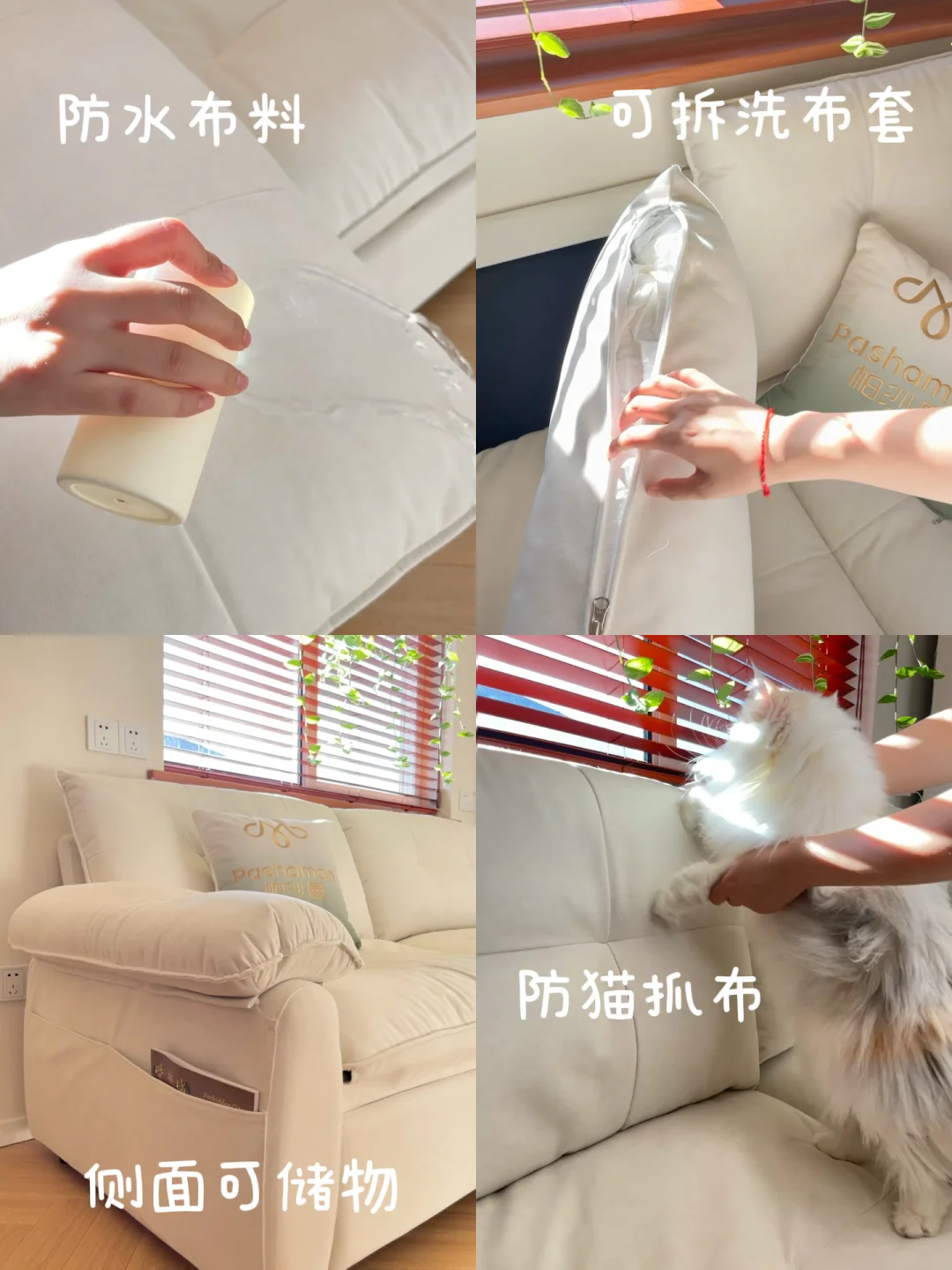 我家有三只猫🐈,所以特地选的这款沙发床。因为布料是猫抓布的,不怕小猫搞破坏~除此之外,这个布料还很神奇,像荷叶一样,可以疏水💦。一杯水泼上去都不会打湿沙发。布套可以拆洗,即使弄脏也不怕。侧面还很贴心地设计了小口袋,可以放书📚放充电器🔌等杂物~超实用!