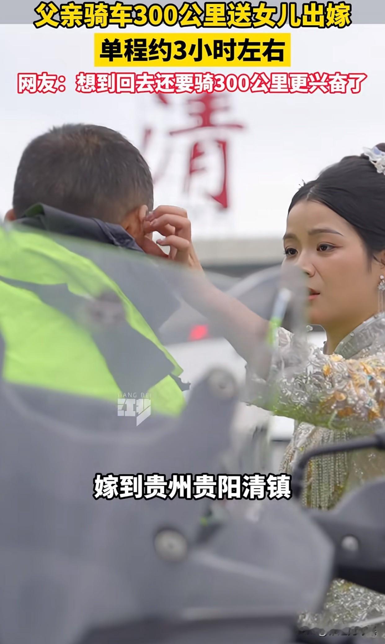 这真破防了!”贵州一位老爸为了参加女儿婚礼,没搭亲戚的车,也没坐高铁,一个人骑着摩托车跑了300公里送女儿到婆家。说实话,这段特别的送嫁路,装满了爸爸沉甸甸的爱。 女儿结婚那天,老爸紧紧握着摩托车钥匙默默跟着。婚车在前面开,他就骑着摩托在后面追,三个多小时一路辛苦。拍视频的人都感动哭了,说头盔下面,老爸的眼神一直没离开过女儿的方向。 要我说,比起那些大排场的婚礼,这300公里的摩托车印才是最好的嫁妆。爸爸的爱从来不说大话,却用行动让人感动得想哭。现在人都讲究仪式感,却忘了最真的感情往往最安静。 其实我觉得,每家可能都有这样“不太会说话但特别实在”的老爸。他们用最普通的方式爱护孩子,这大概就是咱们中国人表达感情的特有方式,爱不用多说,都藏在赶路的三个小时里,藏在每一公里的坚持中。